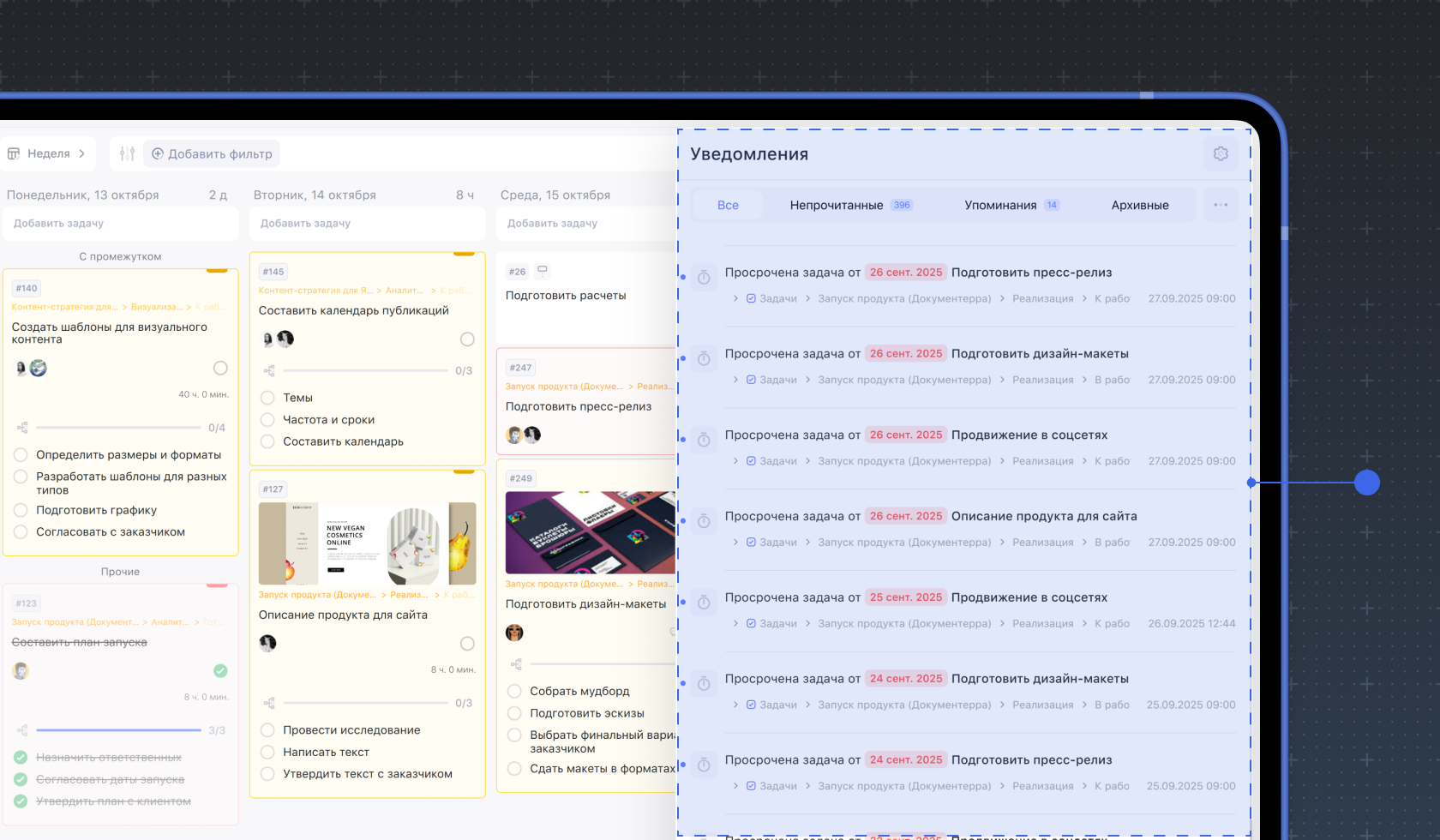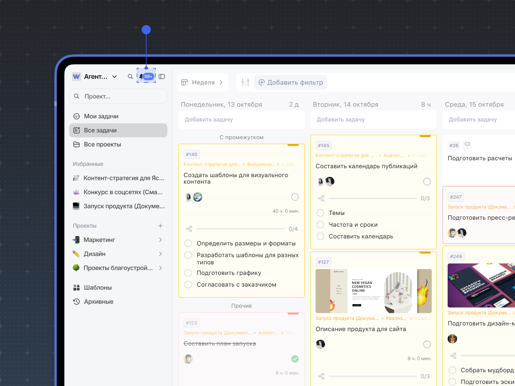 В рабочем графике часто возникают задачи, которые нужно выполнить в конкретное время — например, встретиться с клиентом в согласованное время или прийти на созвон с командой . Для этих целей в Weeek можно настроить напоминание о задаче. Уведомление о предстоящей задаче придет в нужный момент.