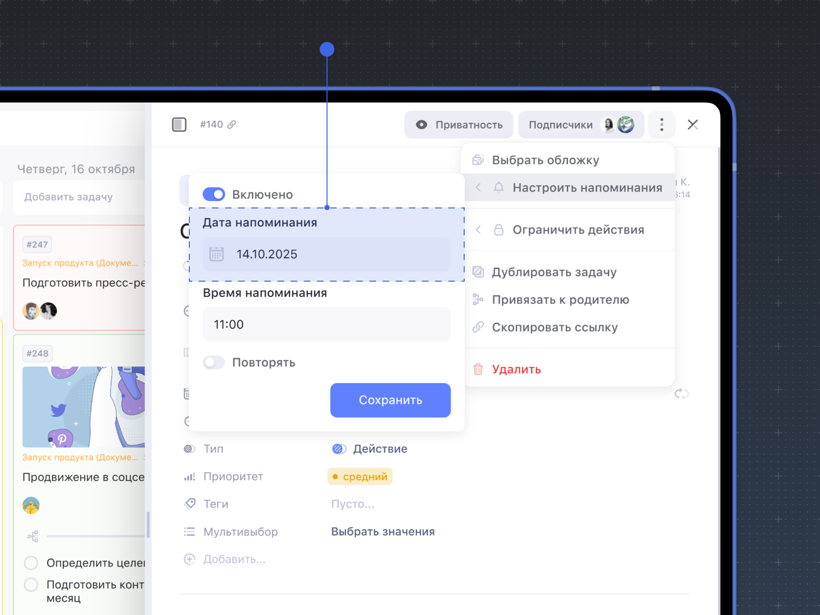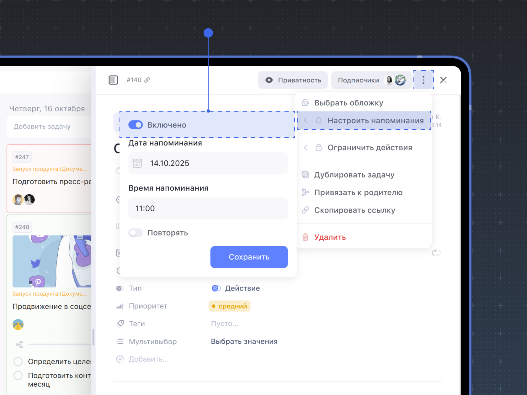 Чтобы добавить напоминание о задаче, перейдите в её в карточку, нажмите на три точки в верхнем правом углу и выберите Настроить напоминания.