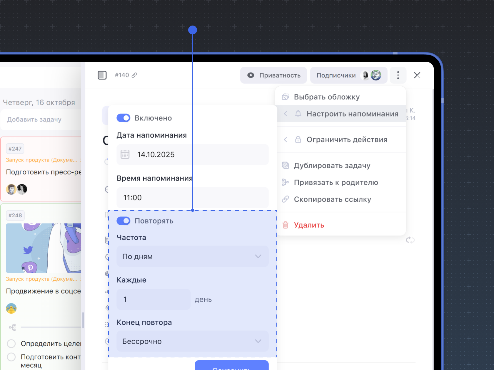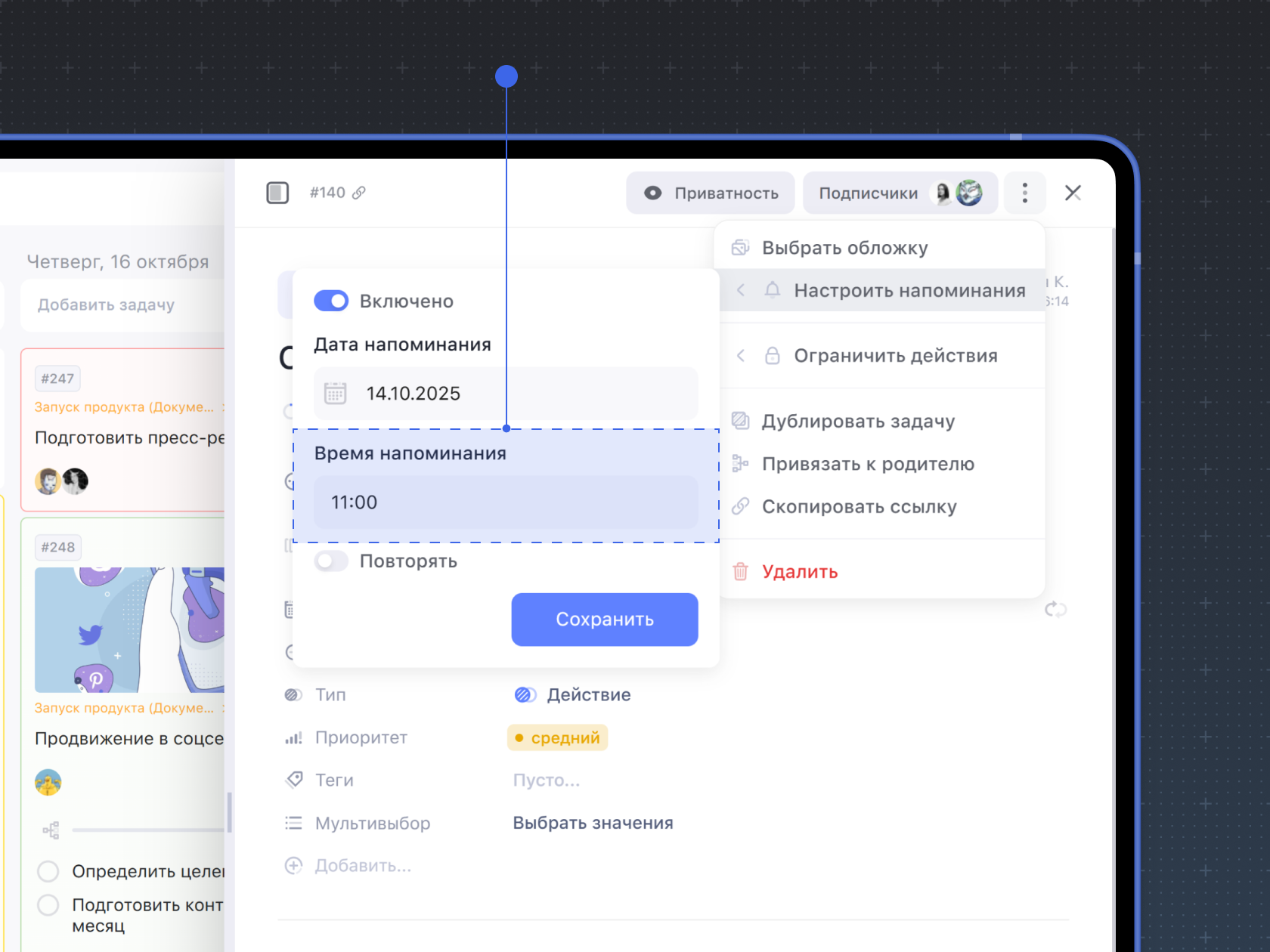 Как настроить напоминание о задаче