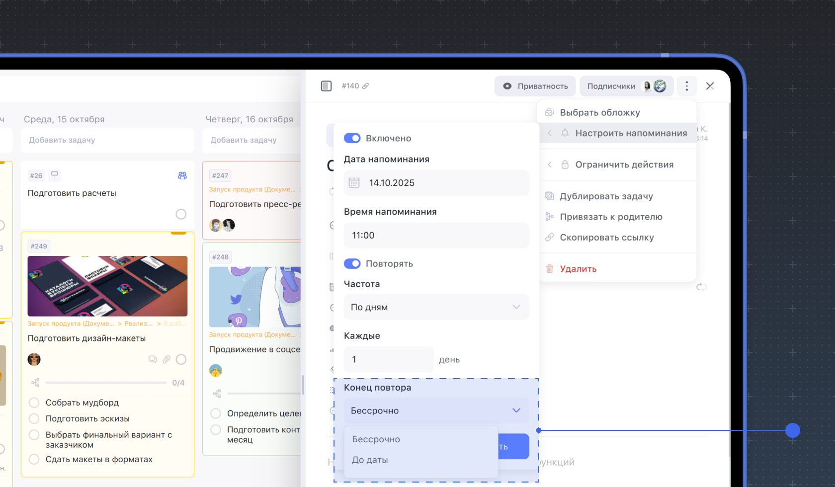 Конец повтора. Повторять напоминание можно бесконечно — для этого оставьте значение Бессрочно. Чтобы повторять напоминание ограниченный период времени, выберите значение До даты и в поле Дата окончания установите дату окончания повтора.