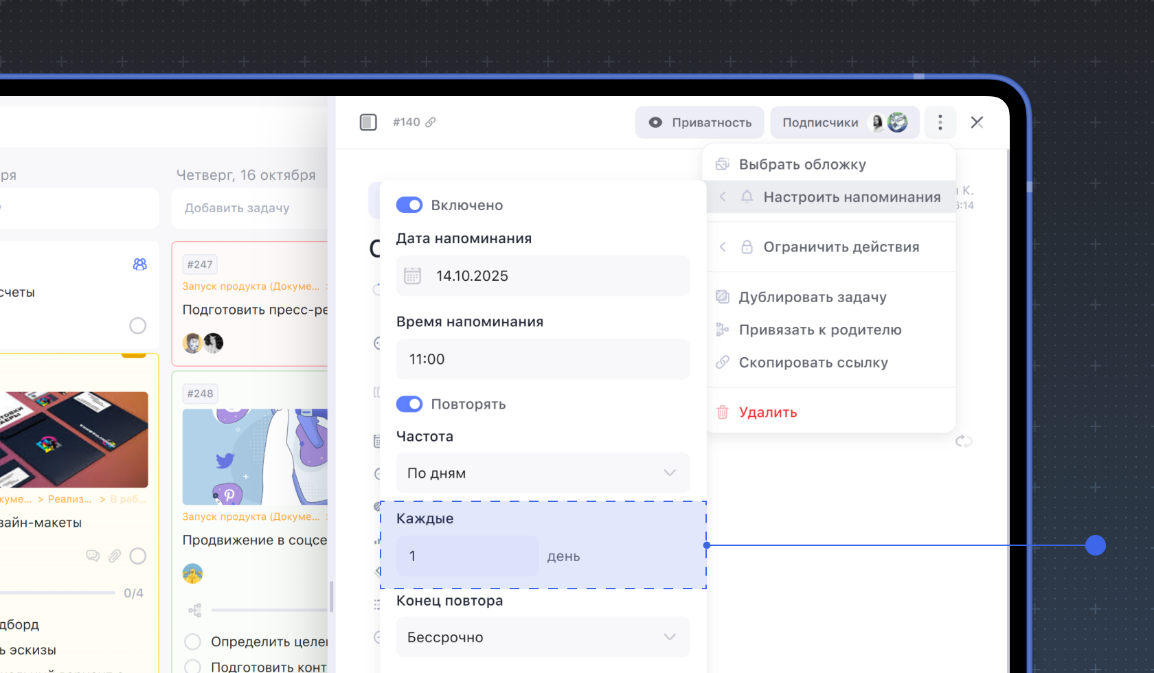 Чтобы уведомление повторялось, активируйте переключатель Повторять и выберите настройки повторения.
