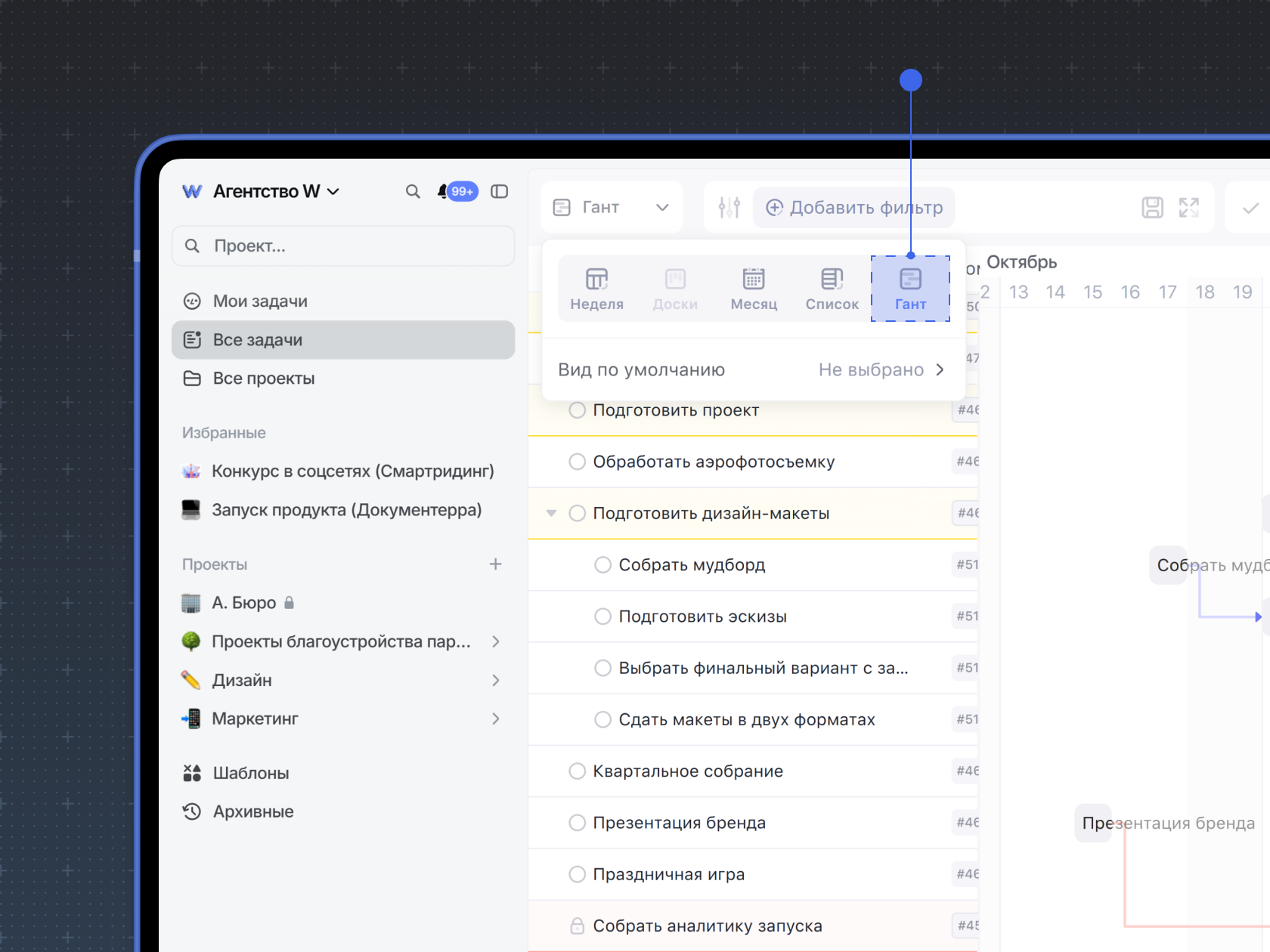 Чтобы посмотреть связи и зависимости между задачами, перейдите в режим просмотра Гант.