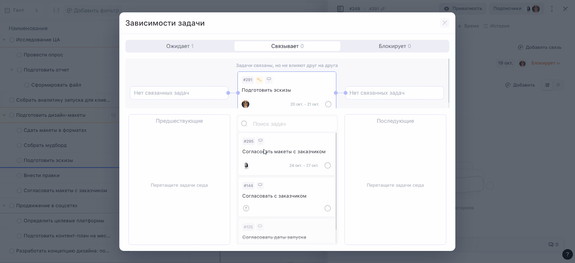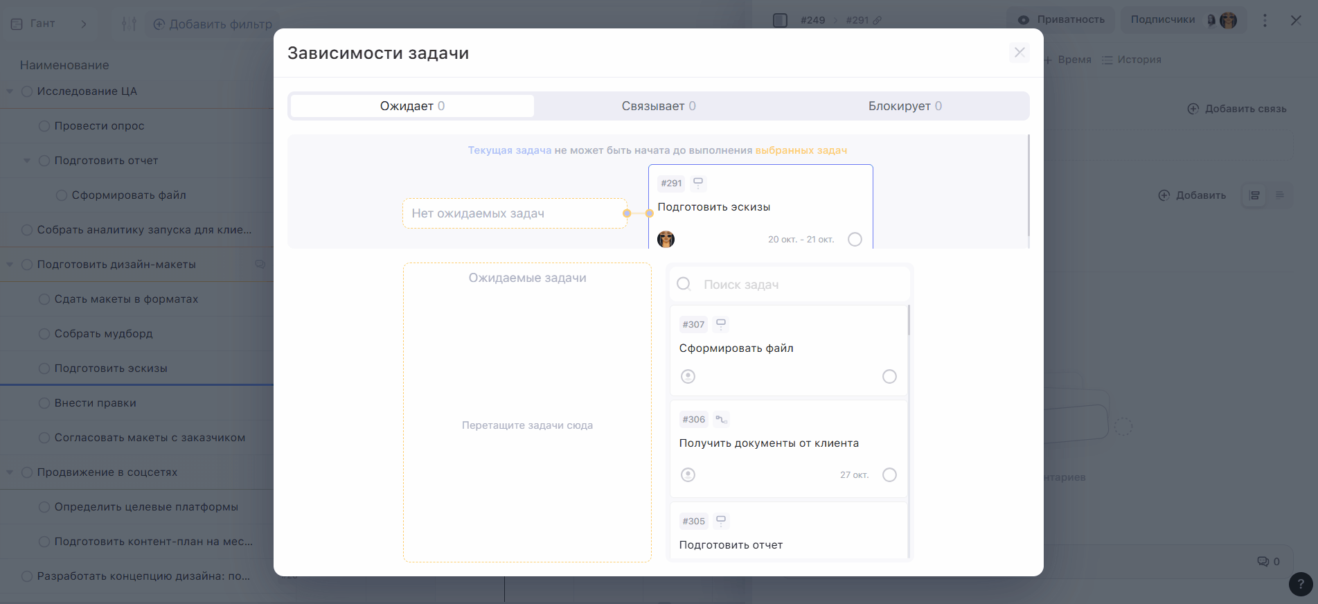 Чтобы добавить связанную задачу, начните вводить её название в поле для поиска и перетяните её в колонку Ожидаемые задачи.