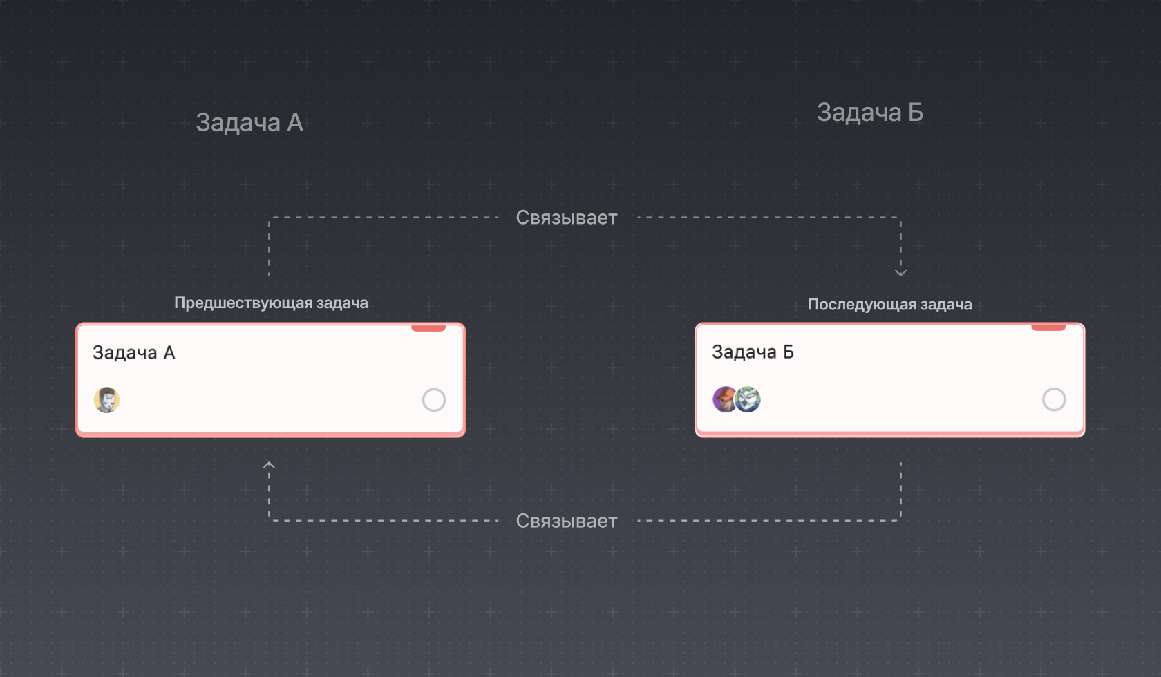 Связывает — это направленная связь между задачами. Если Задача А связана с последующей Задачей Б, то Задача Б связана с предшествующей ей Задачей А