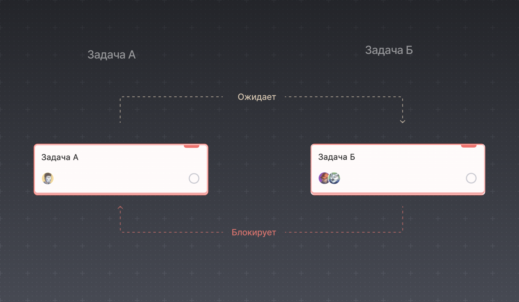Ожидает и Блокирует — это две взаимные зависимости между задачами. Если Задача А блокирует выполнение Задачи Б, то Задача Б ожидает выполнение задачи А