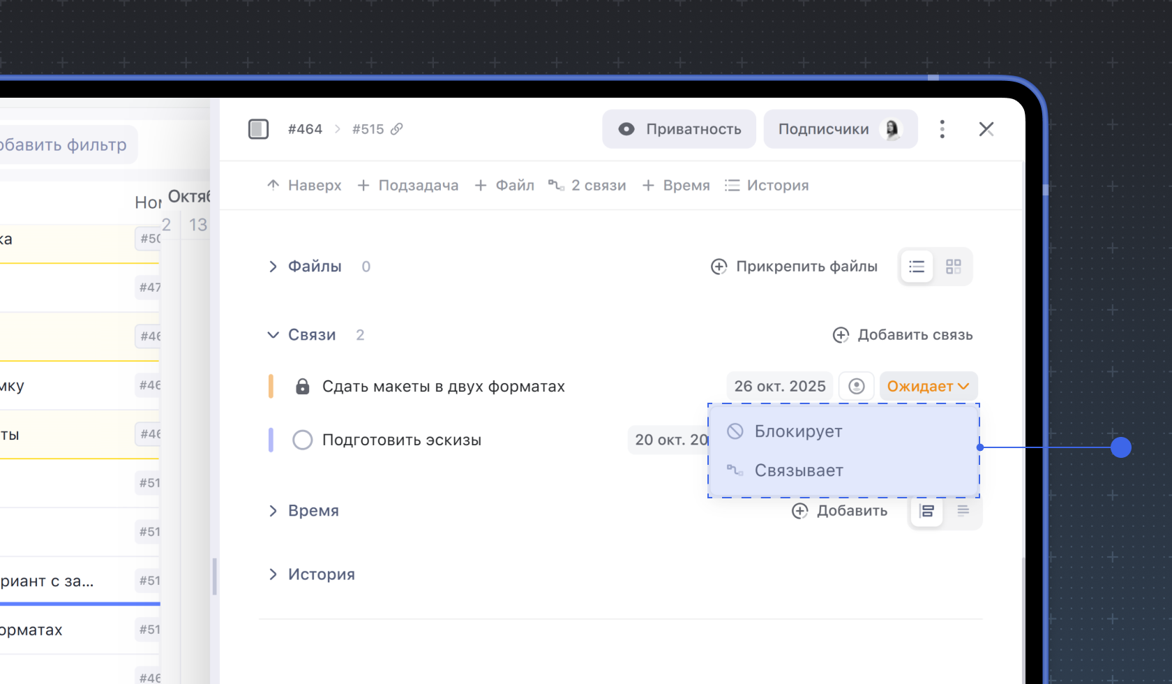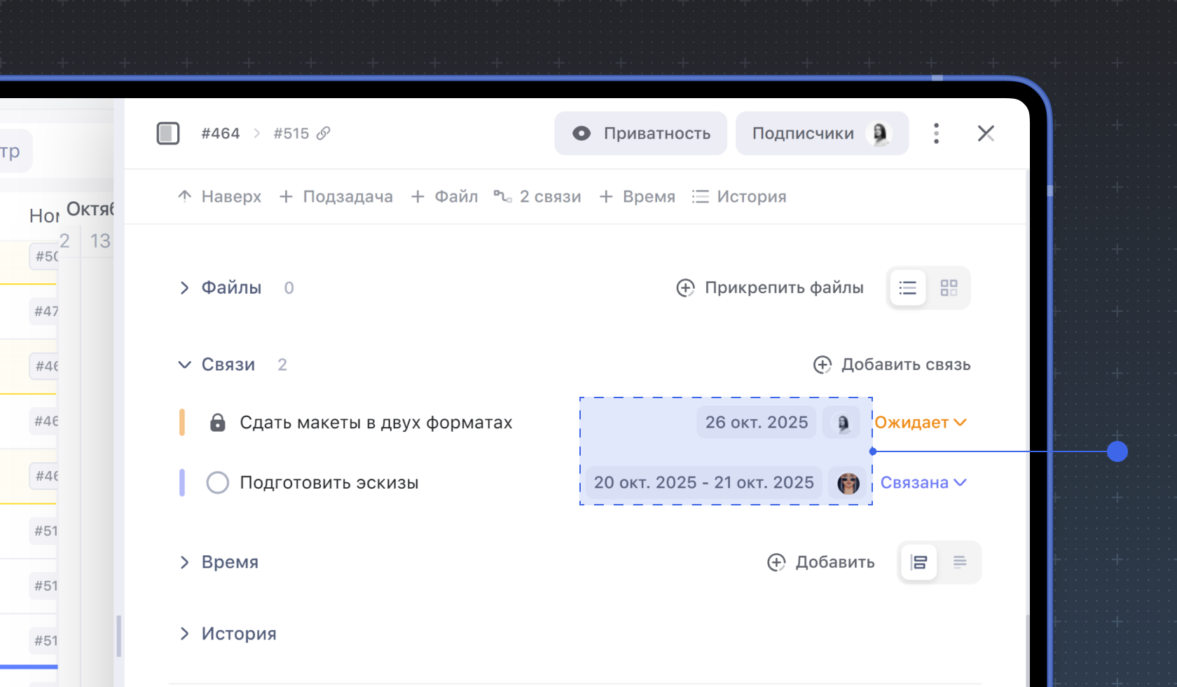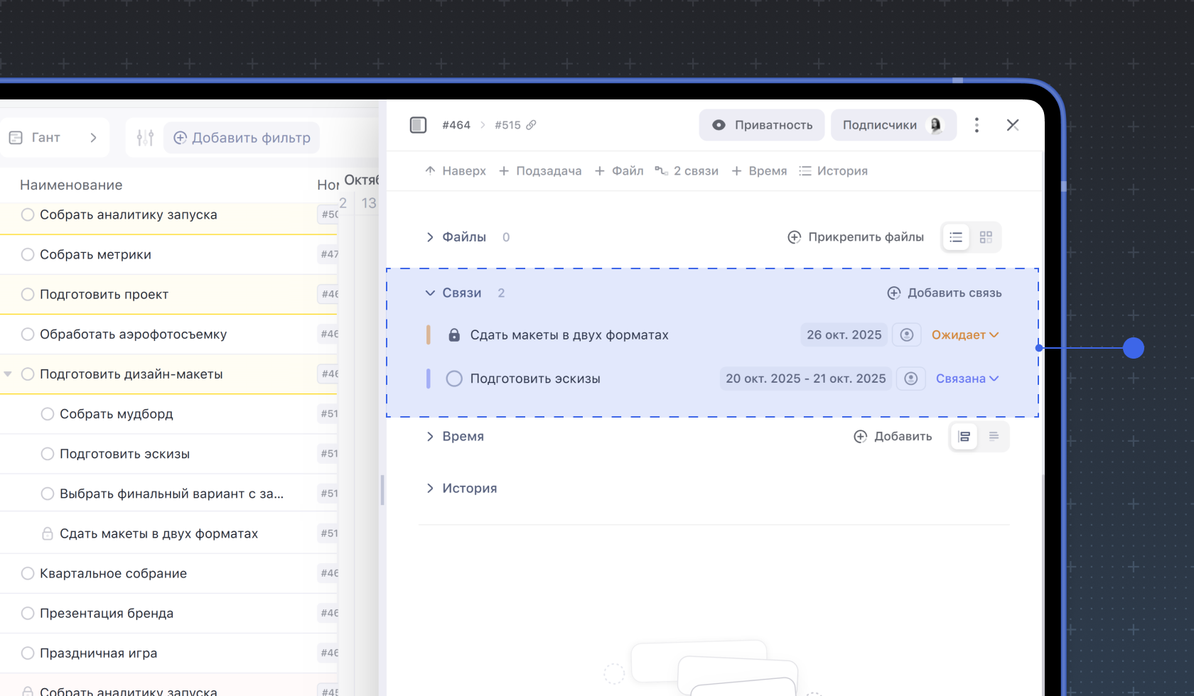 Чтобы добавить связи или зависимости задаче, перейдите в её карточку. На вкладке Связи нажмите Добавить связь.