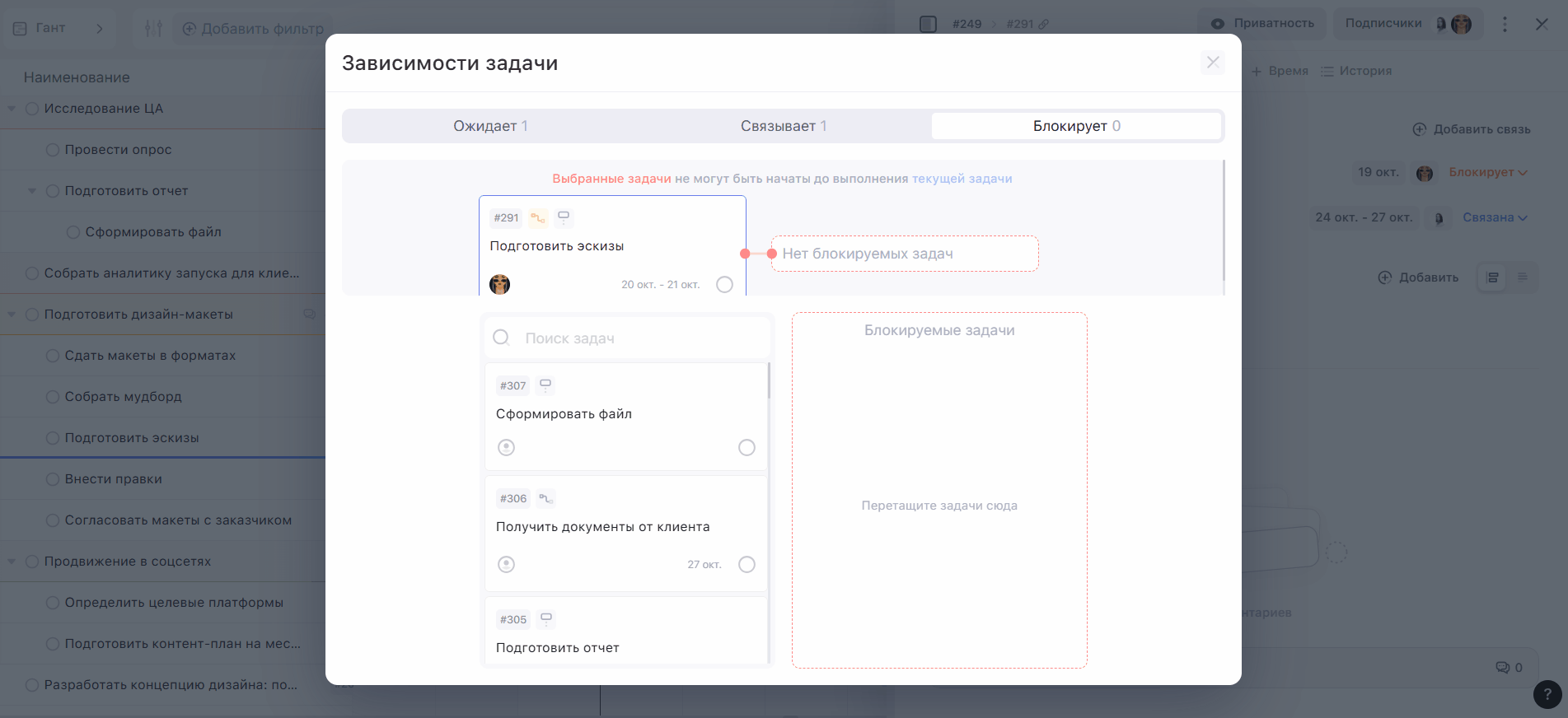 Чтобы добавить зависимую задачу, перетяните её в колонку Блокируемые задачи.