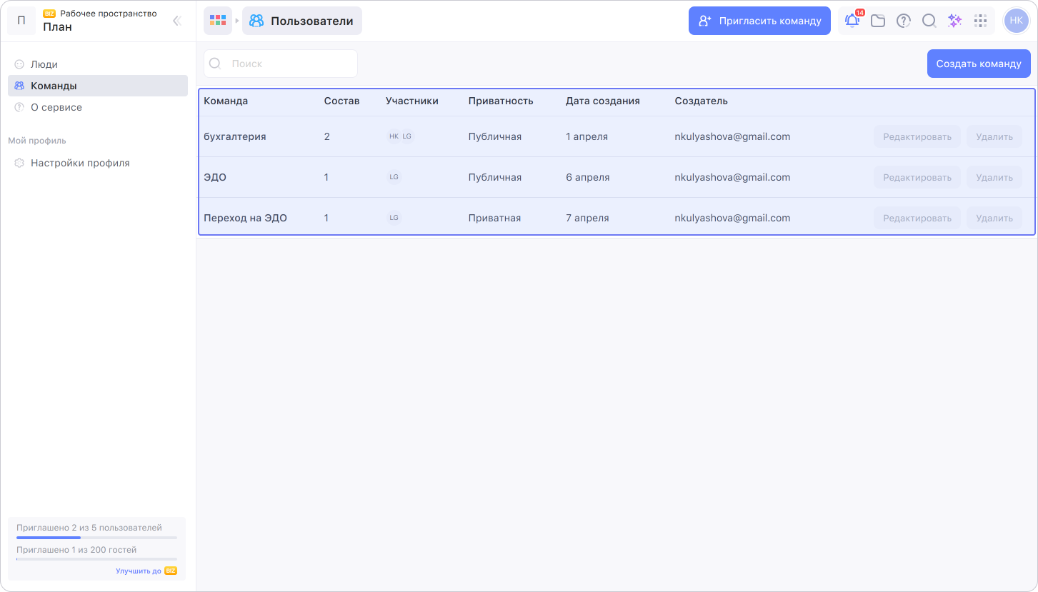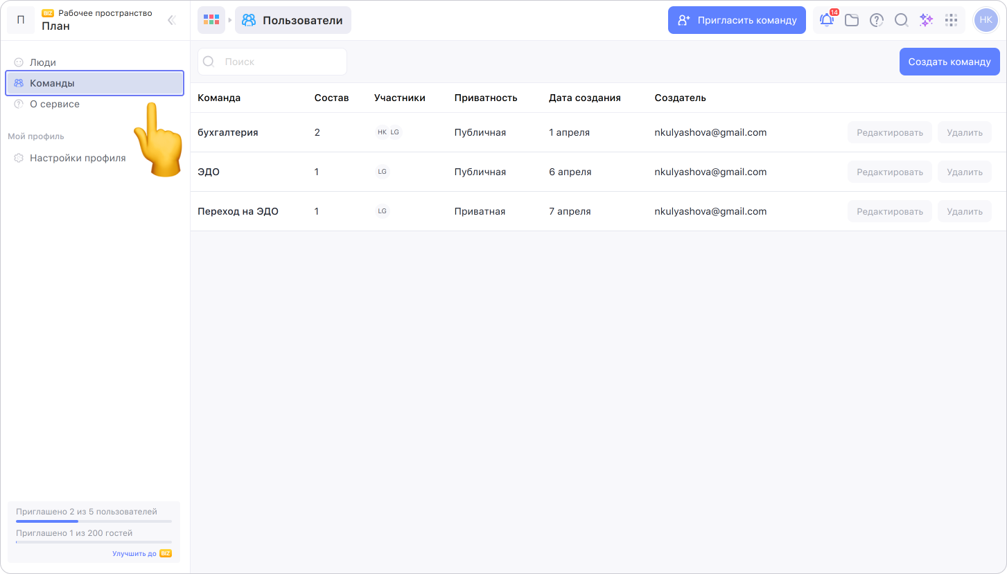 Чтобы посмотреть список команд рабочего пространства, перейдите в сервис Пользователи и выберите раздел Команды.