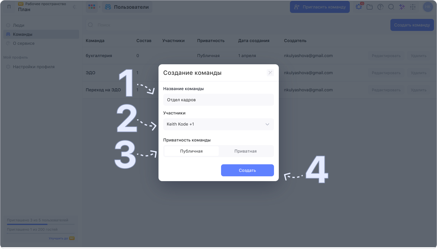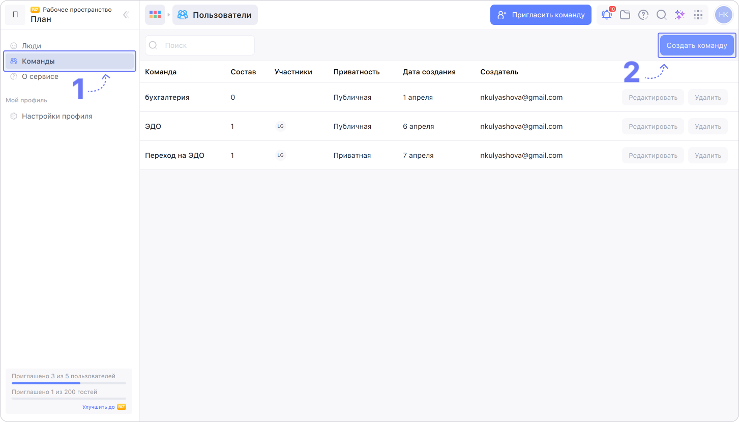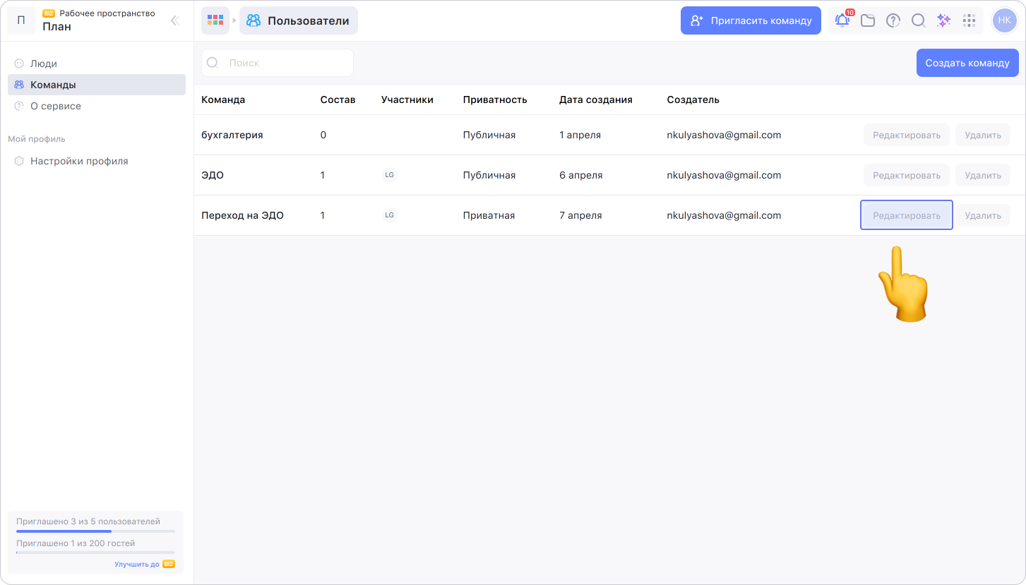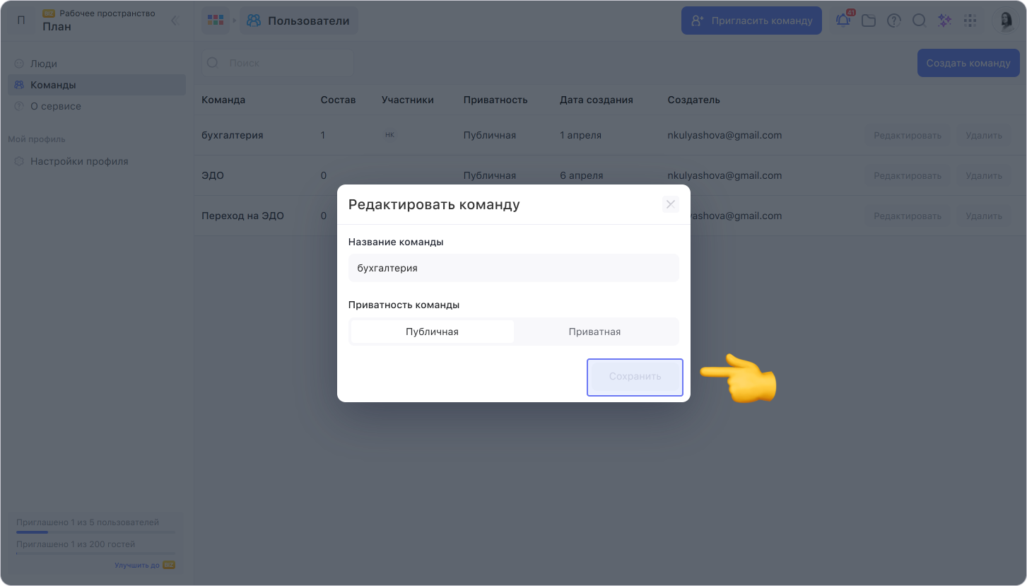 У созданной команды можно отредактировать название и приватность. Для этого в сервисе Пользователи на панели участников выберите Команды.
