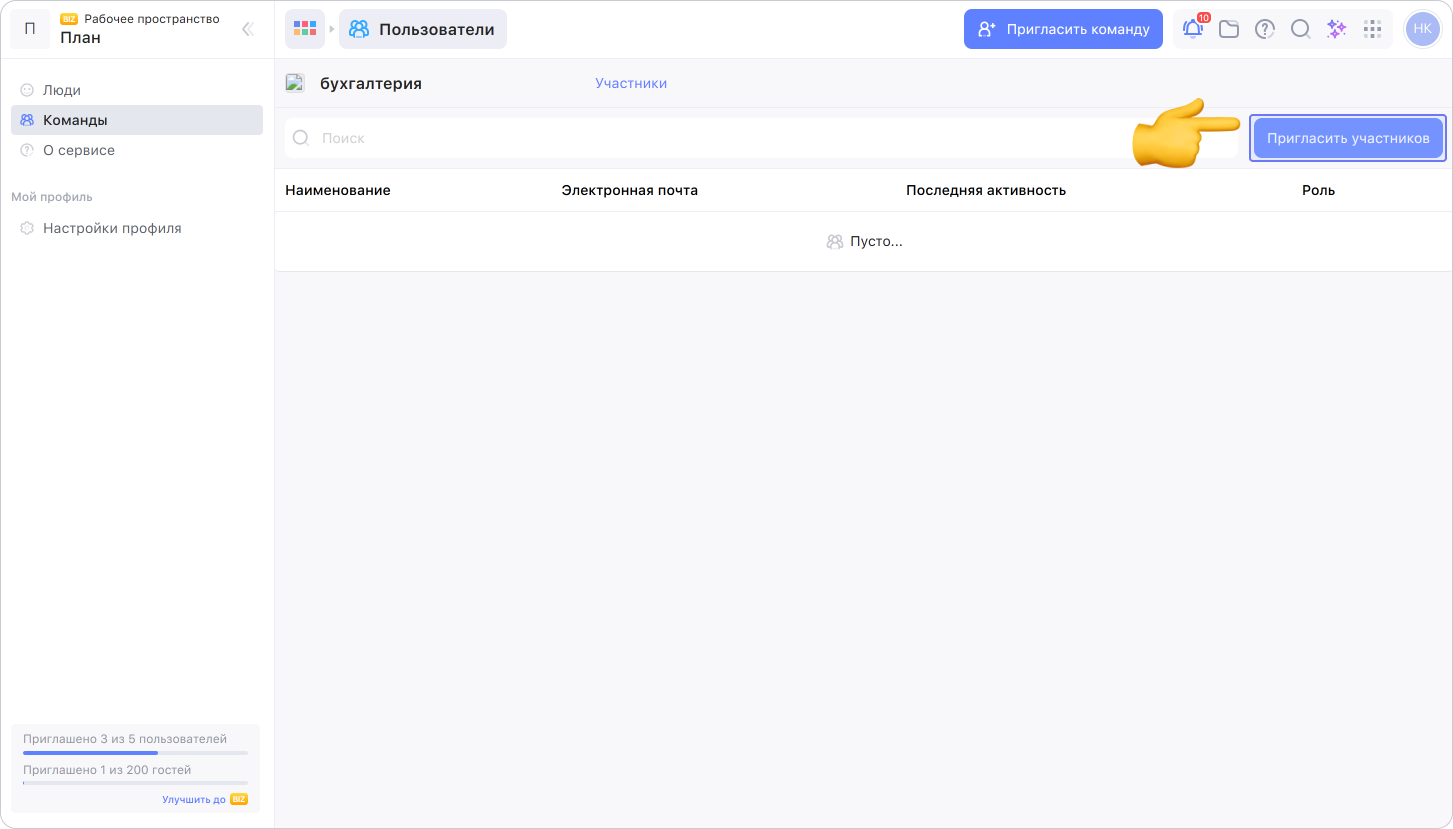 Чтобы пригласить участников в команду, нажмите на строку нужной команды. Затем нажмите на Пригласить участников.