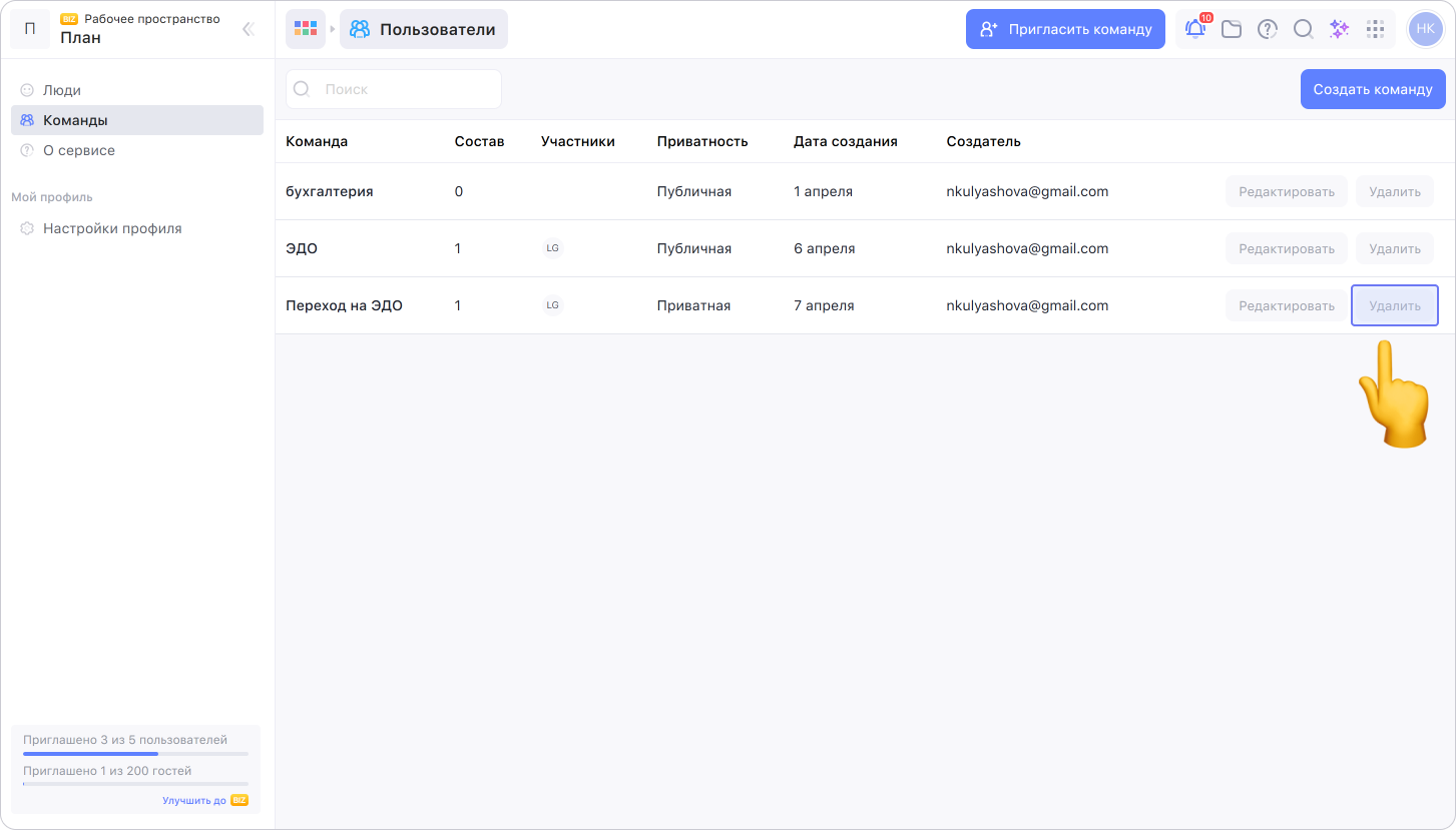 Чтобы удалить команду, в её строке справа нажмите на кнопку Удалить, затем подтвердите удаление.