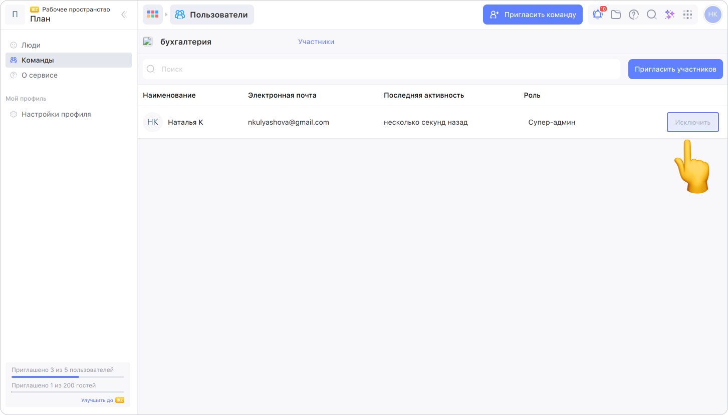 Чтобы исключить кого-то из команды, перейдите в список её участников. В строке участника справа нажмите на кнопку Исключить, затем подтвердите исключение.