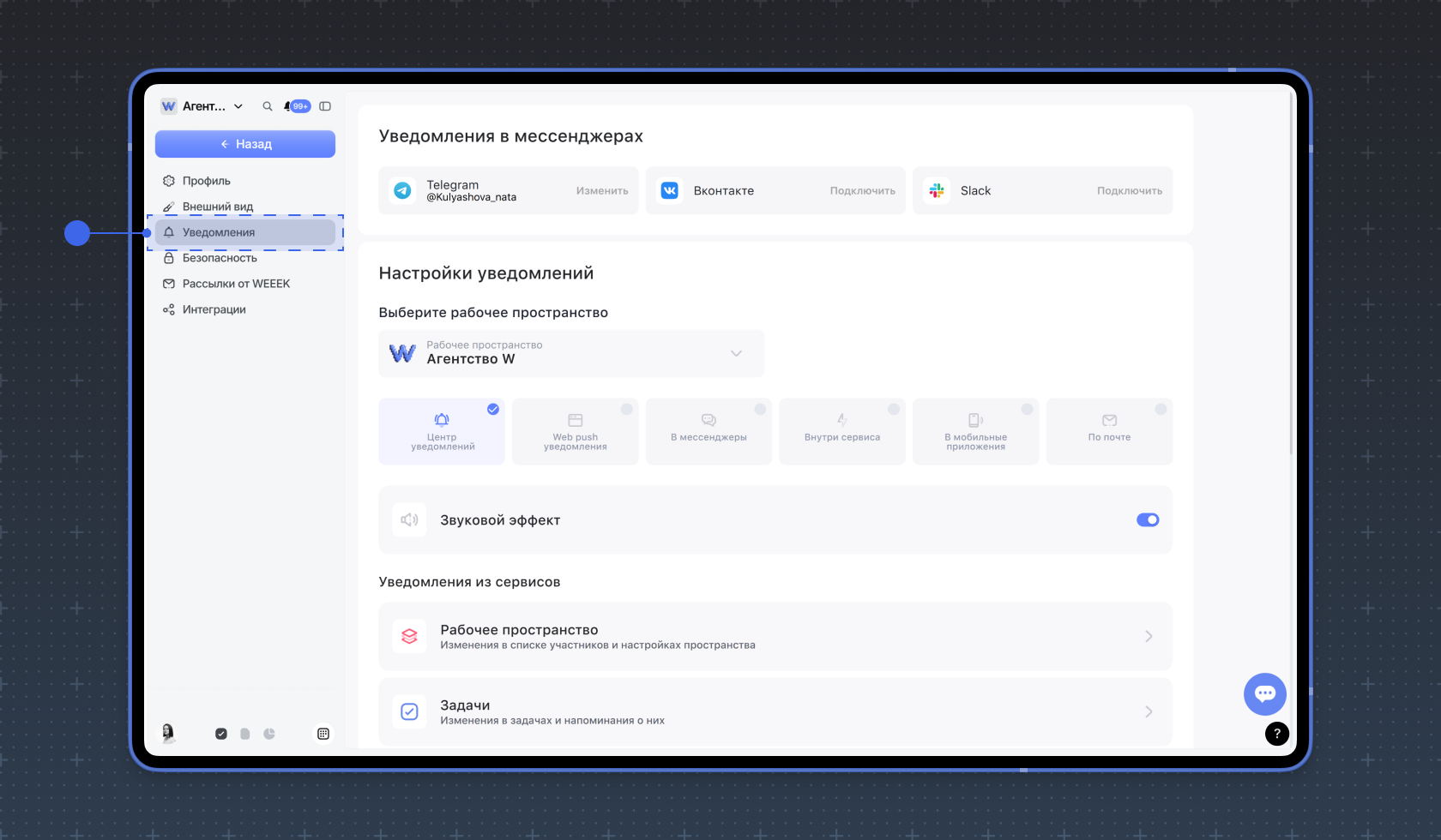 Получайте уведомления о событиях в WEEEK. В разделе Уведомления можно выбрать, в каком виде и в каких ситуациях их получать.