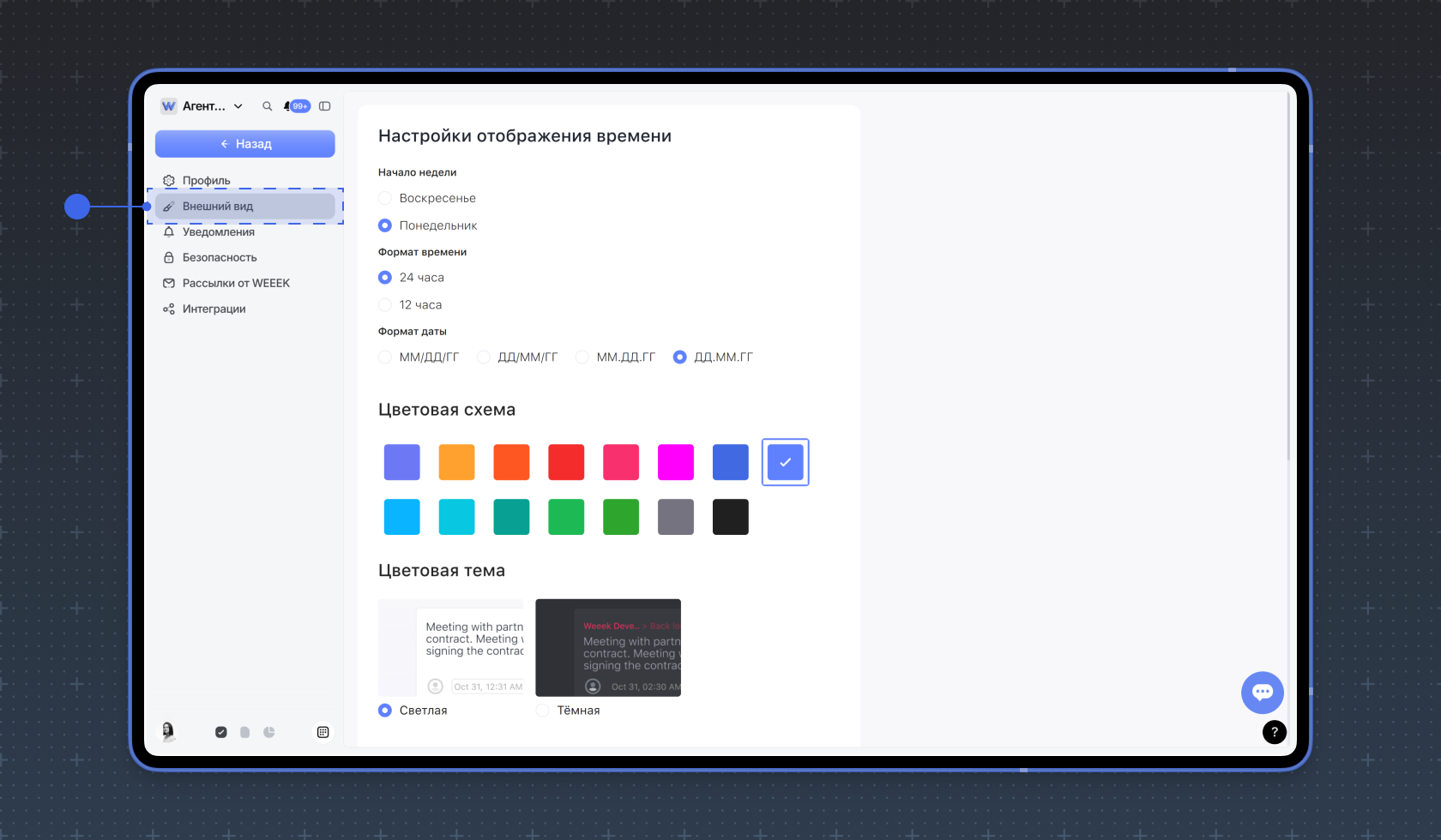 В разделе Внешний вид можно настроить режимы отображения времени и визуальные предпочтения внутри сервиса.