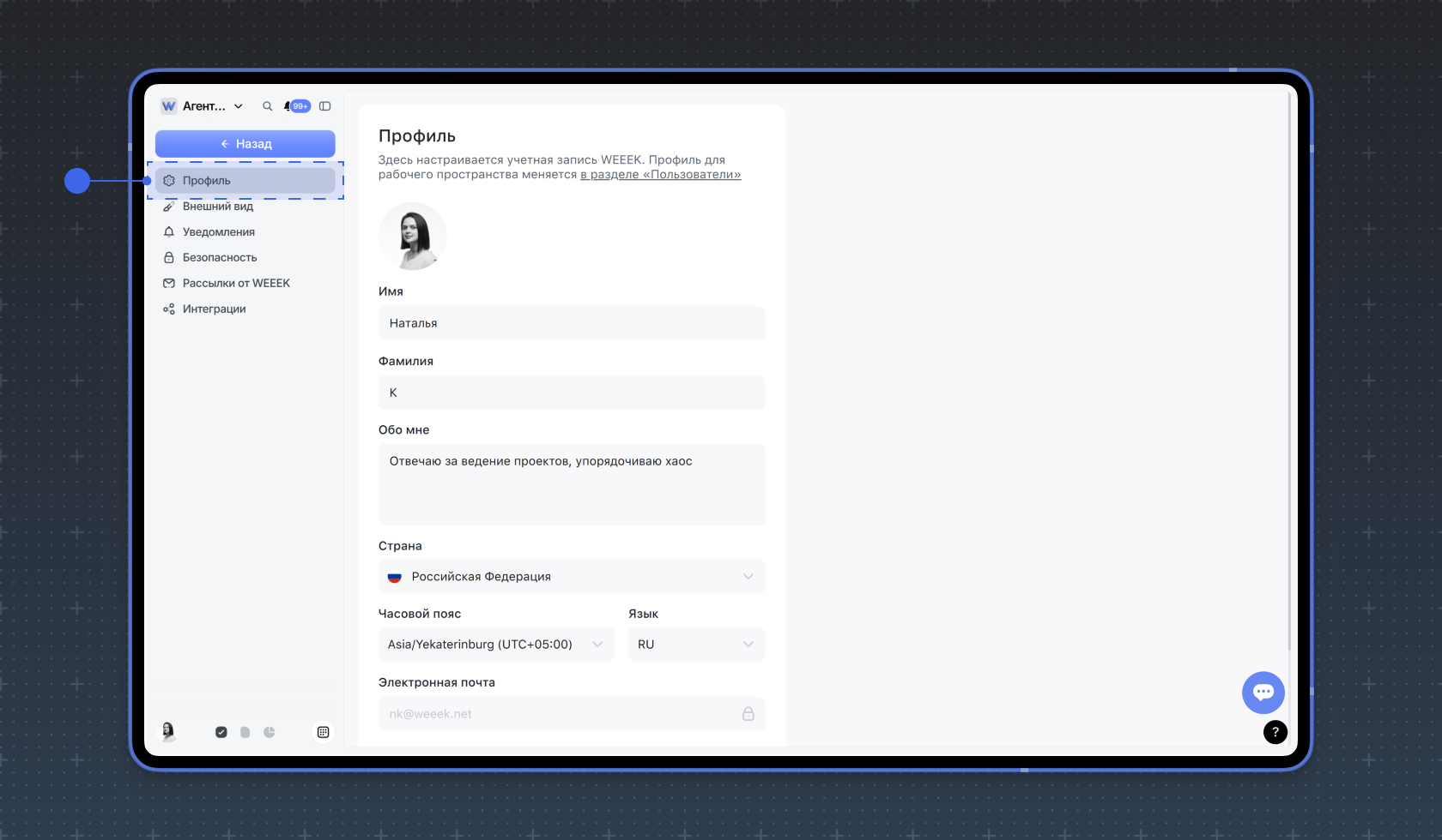 Аккаунт пользователя — это учётная запись, с которой вы зарегистрировались в WEEEK. Данные, которые вы внесёте здесь, не будут отображаться в данных профиля участника рабочего пространства.
