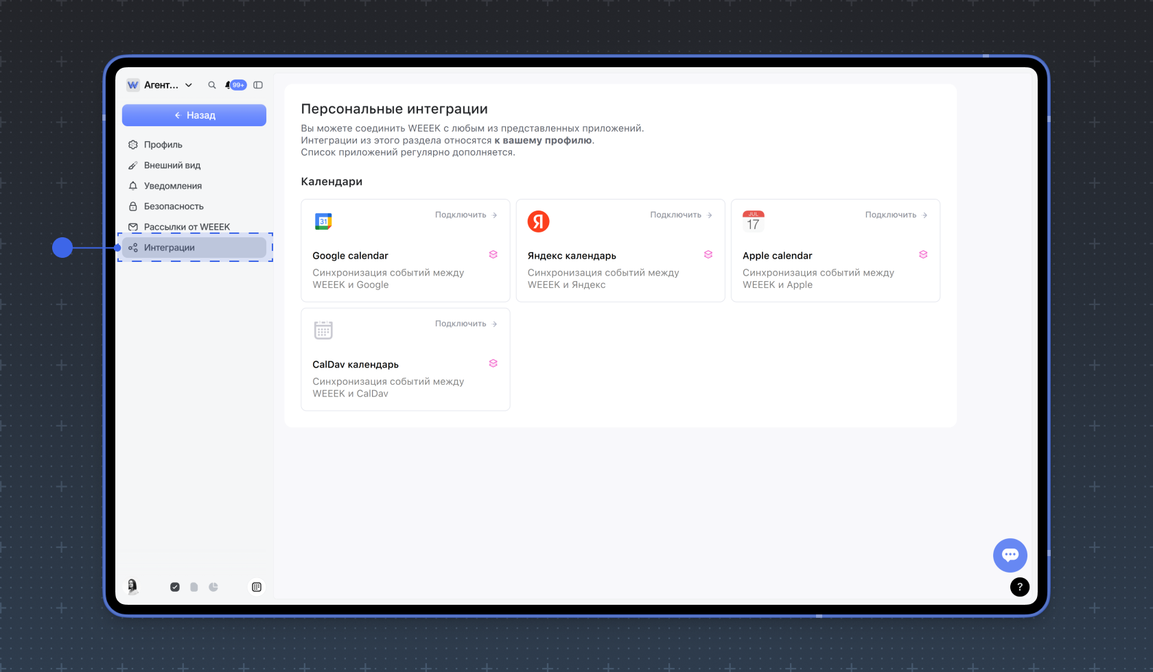 В разделе Интеграции можно объединить WEEEK с любым из ваших приложений для активной передачи данных туда и обратно. Здесь можно настроить интеграции с другими сервисами.