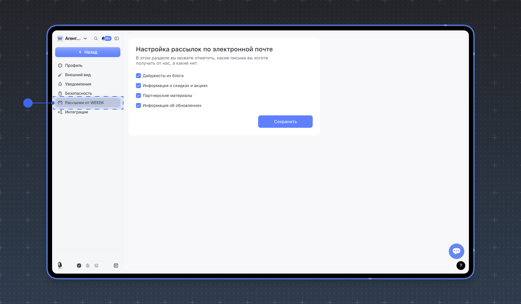 В разделе Рассылки от WEEEK можно настроить получение полезных писем от нас. Вы можете выбрать: