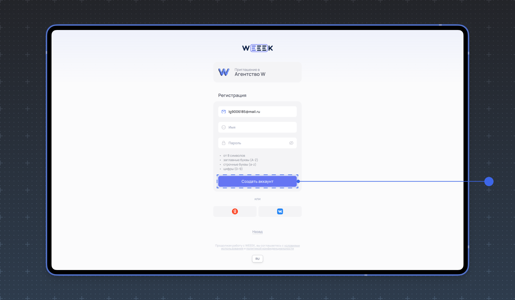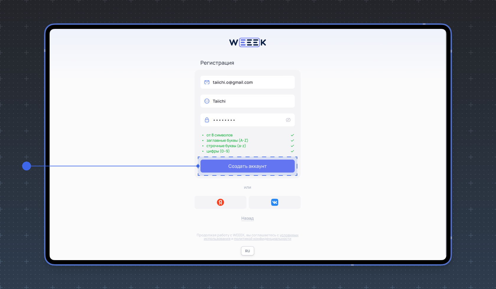 Далее заполните форму, чтобы создать аккаунт в WEEEK.