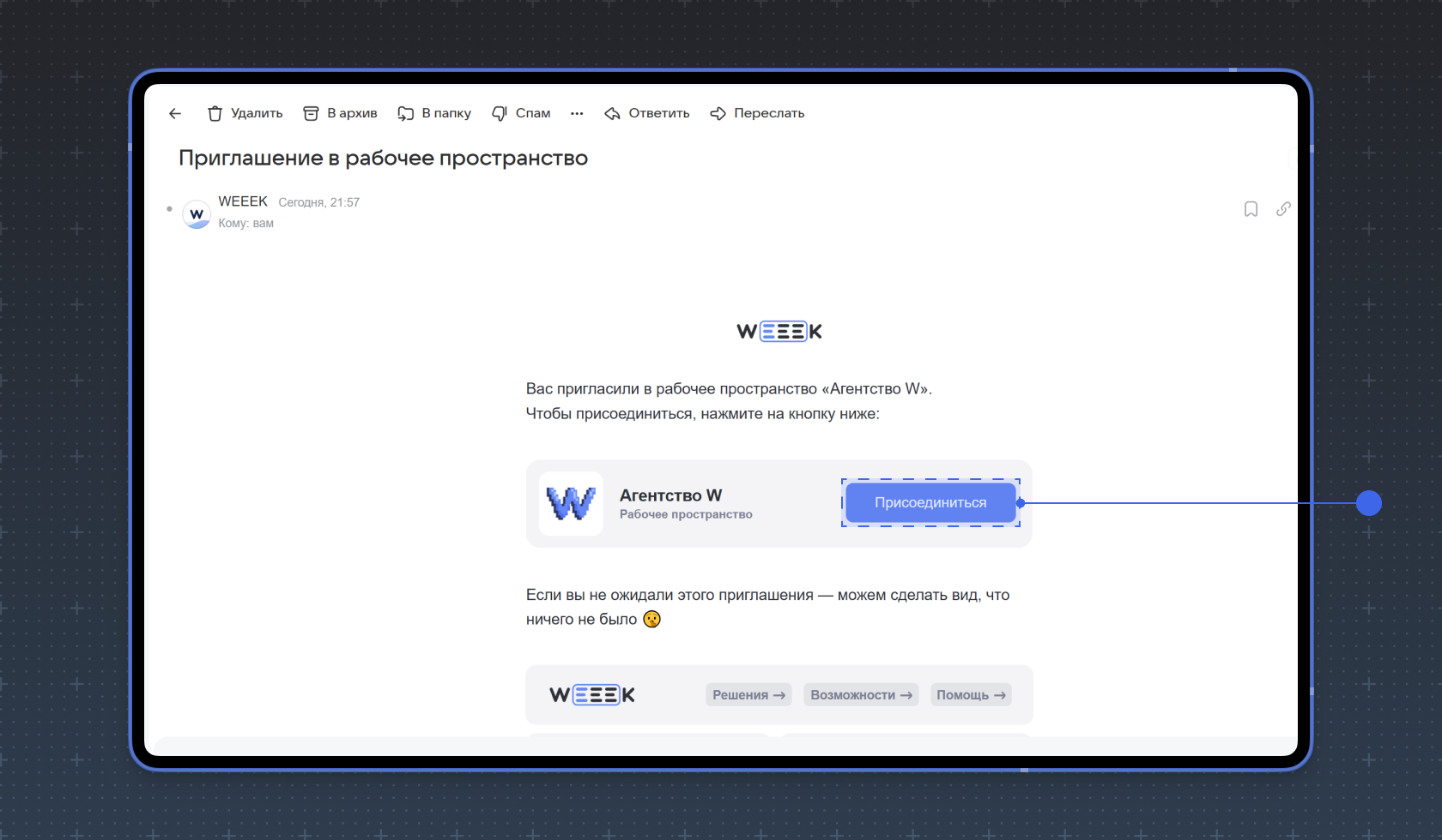 Нажмите на кнопку Присоединиться в письме, чтобы зарегистрироваться в WEEEK и присоединиться к рабочему пространству.