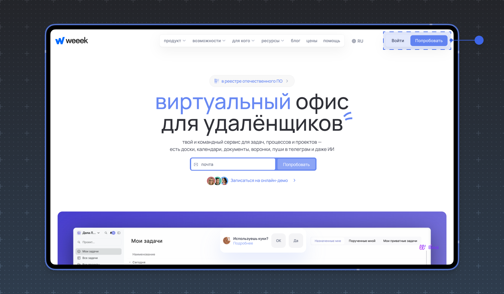 Чтобы создать аккаунт, зайдите на сайт WEEEK, нажмите на кнопку Попробовать в правом верхнем углу.