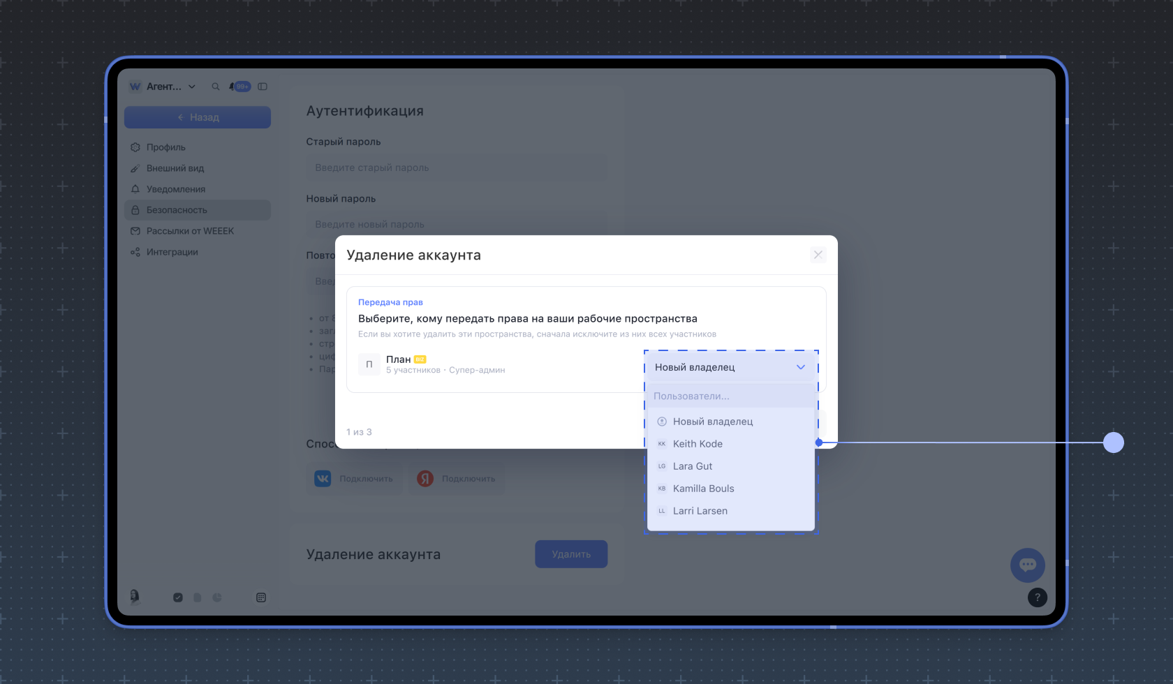 Выберите, кому передать ваши права на рабочие пространства. Вы можете передать права кому-то из действующих участников.
