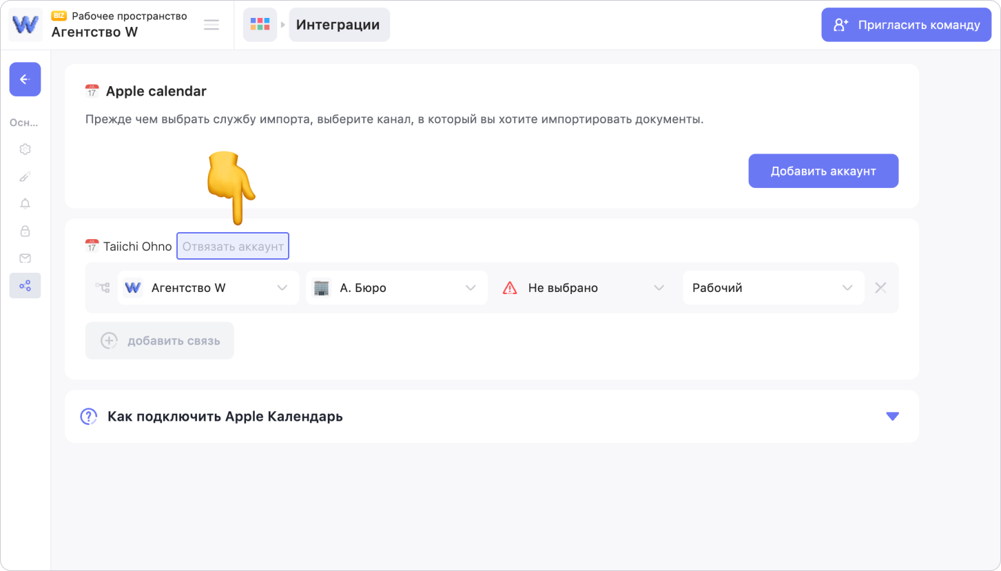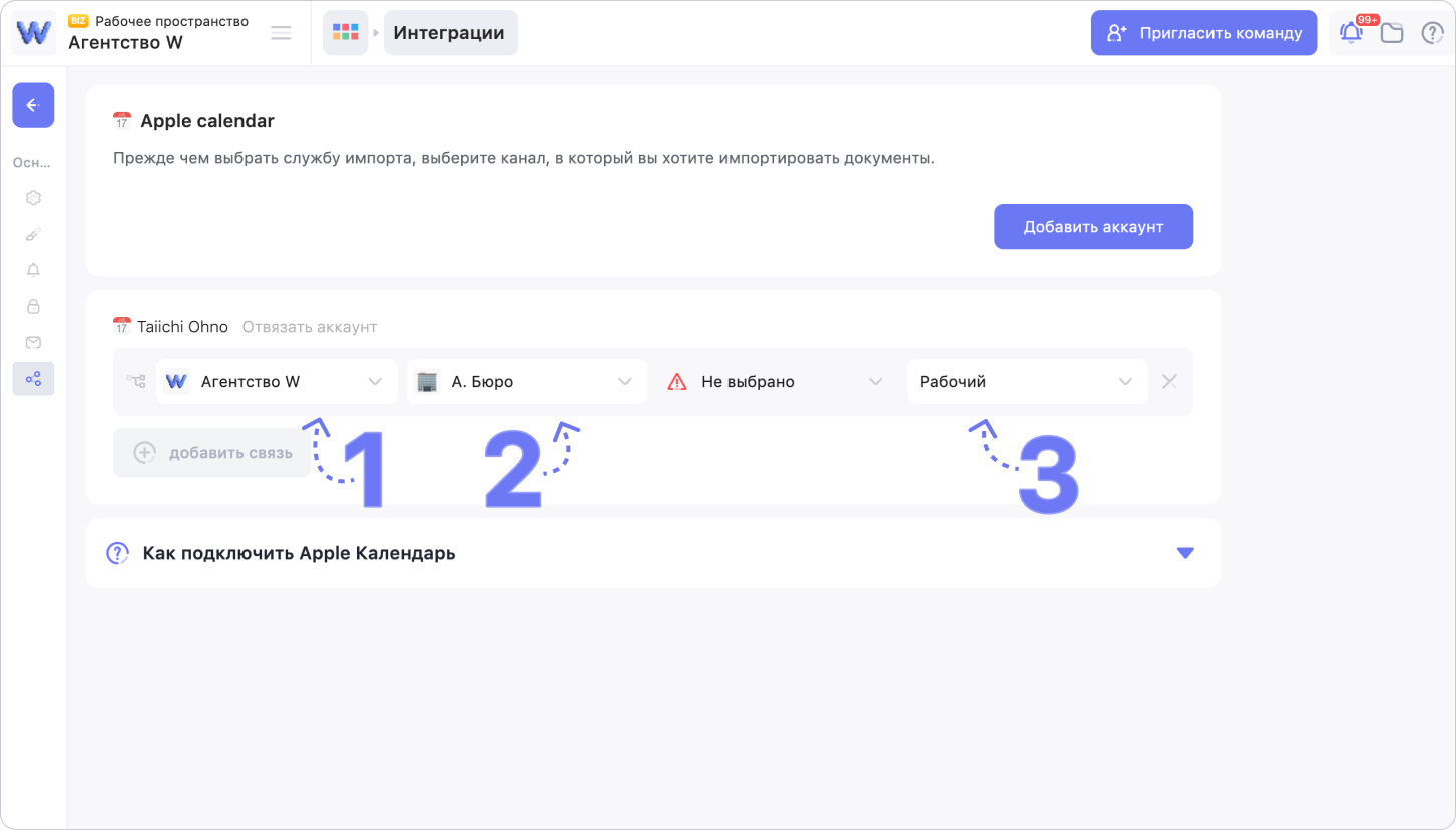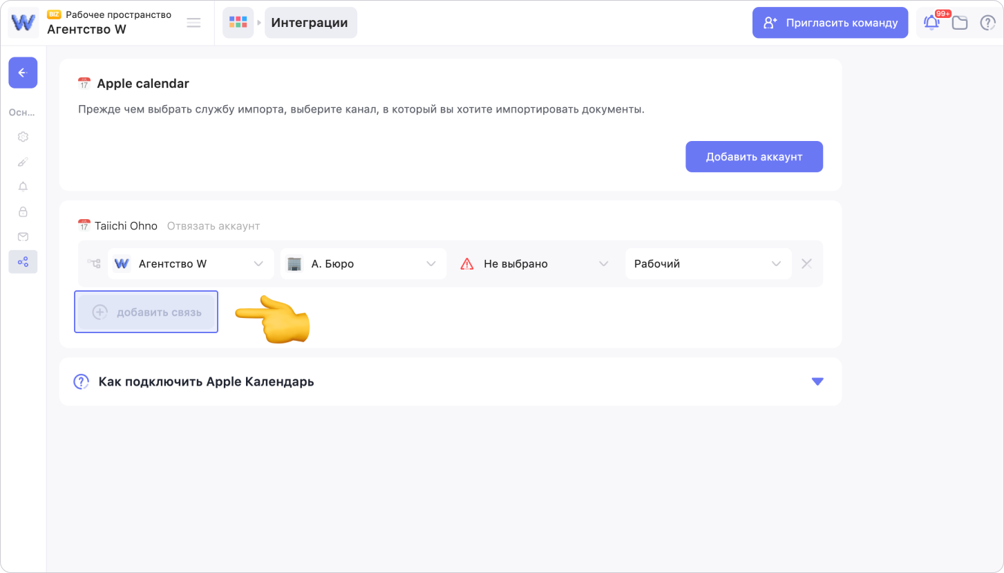 Чтобы подключить Apple Календарь к нескольким рабочим пространствам или проектам, нажмите на кнопку Добавить связь и повторите предыдущие действия.