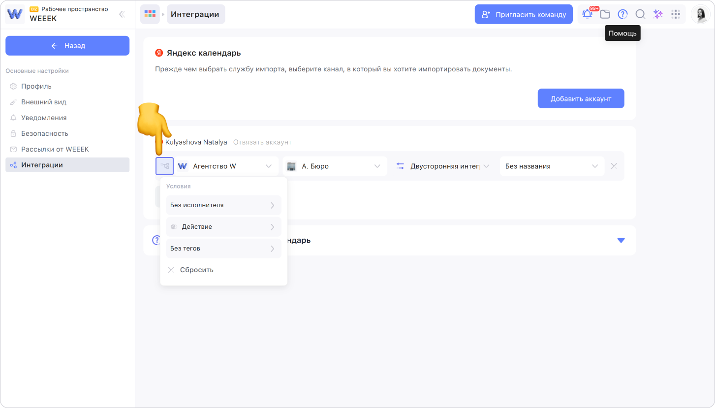 Добавьте условия интеграции: задачи могут передаваться, если выбран конкретный исполнитель, тип карточки — действие, звонок или встреча, один или несколько тегов.