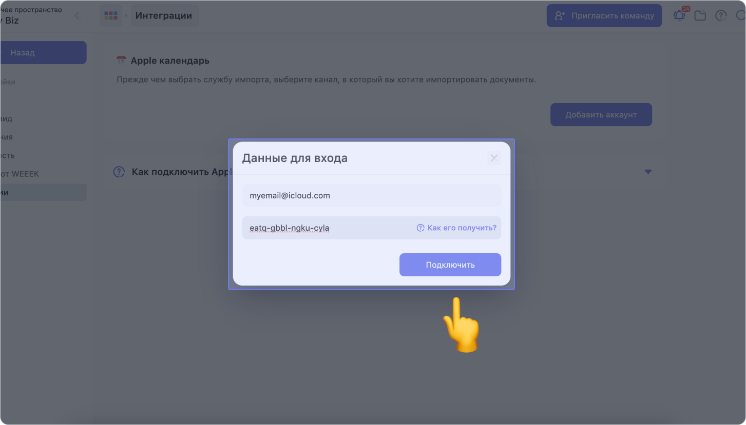 Введите адрес электронной почты Apple и вставьте скопированный ранее специальный пароль. Нажмите Подключить.
