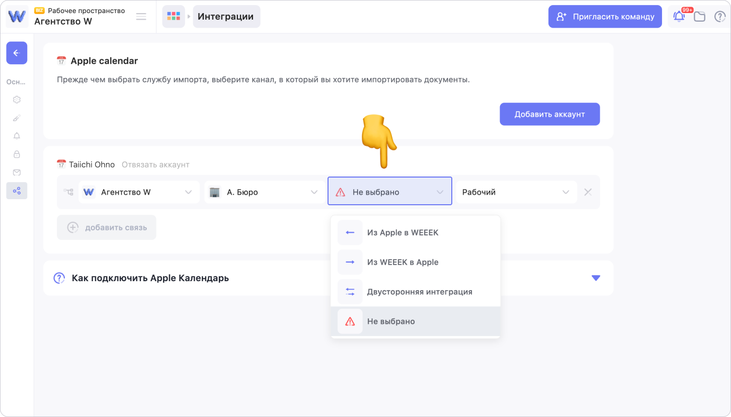 - Двухсторонняя интеграция — Из Apple в Weeek и обратно. Настройки сохранятся автоматически и новые задачи начнут дублироваться согласно указанным условиям