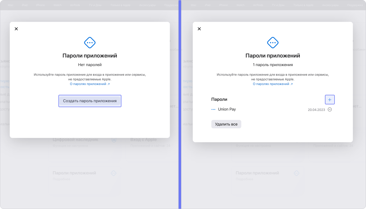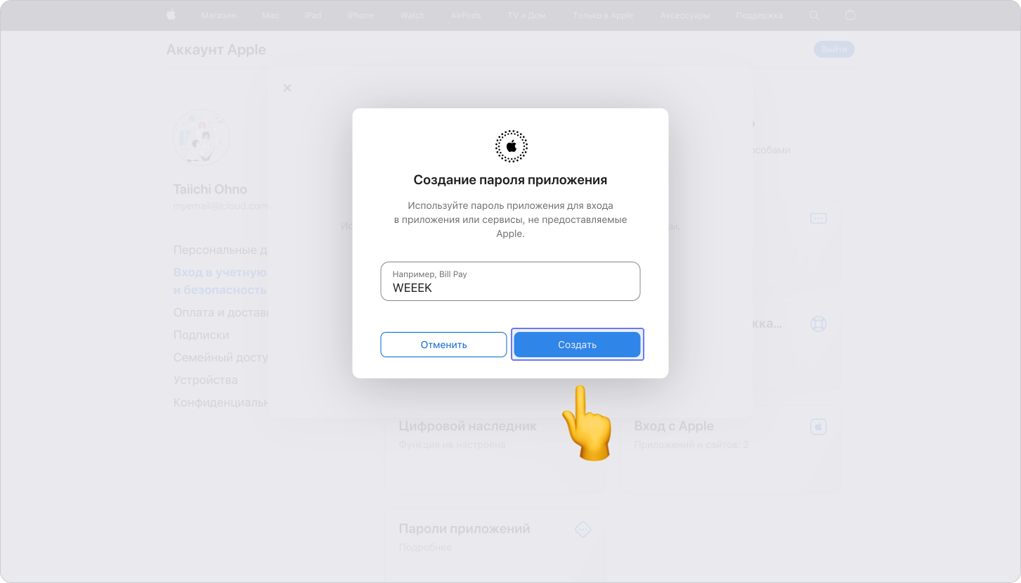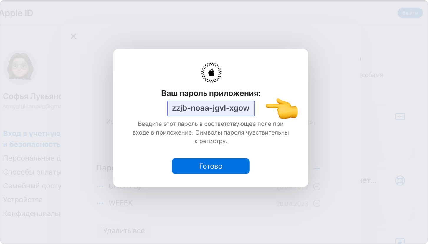 Добавьте новый пароль: нажмите Создать пароль приложения или на +, если у вас уже есть другие пароли.