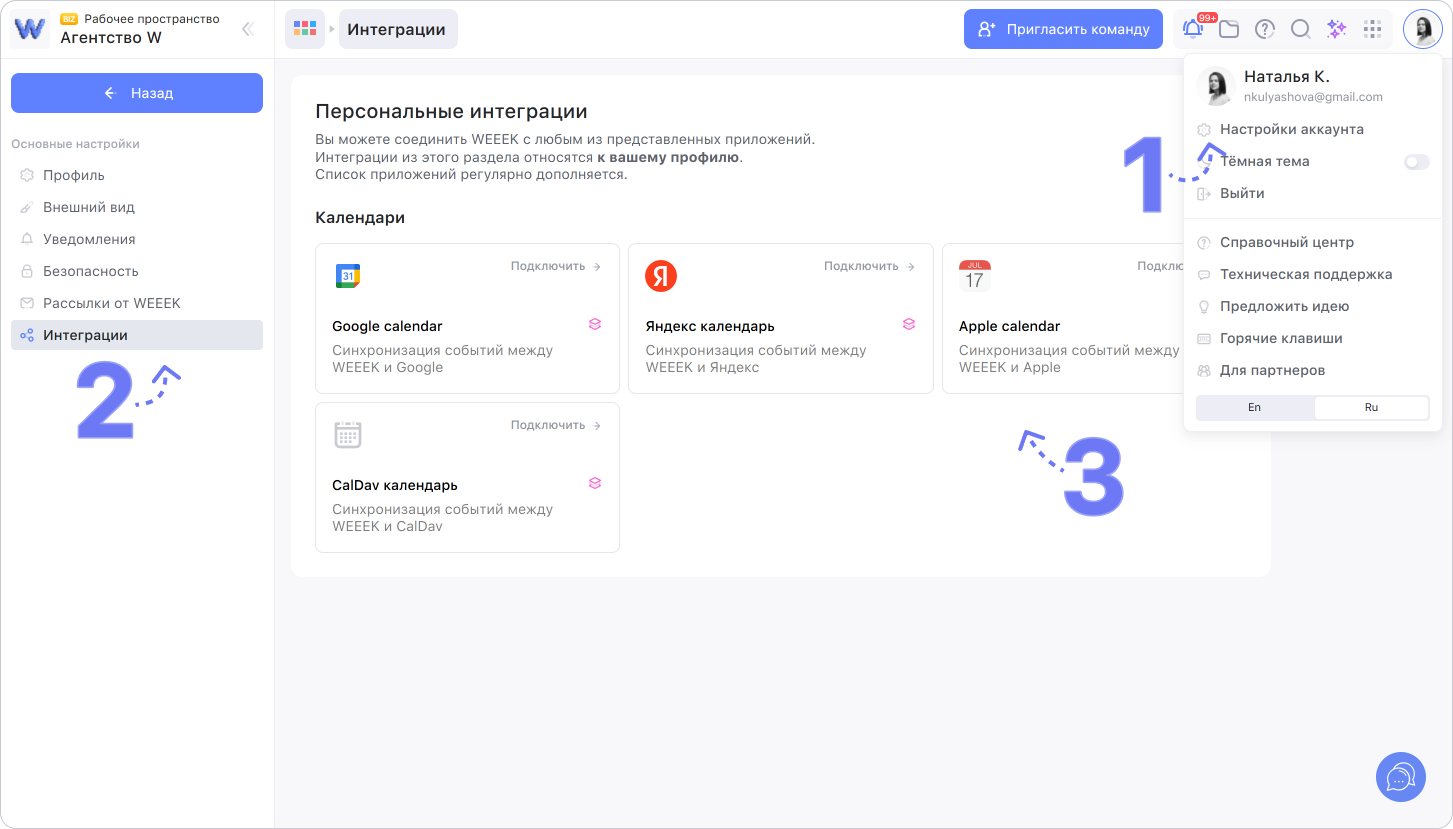 Укажите (1) рабочее пространство, (2) проект, (3) Apple Календарь.