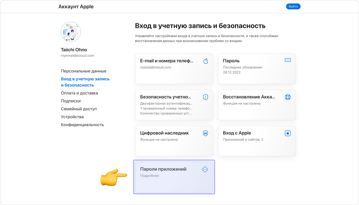 Перейдите на страницу настроек своего Apple ID. Зайдите в Пароли приложений.