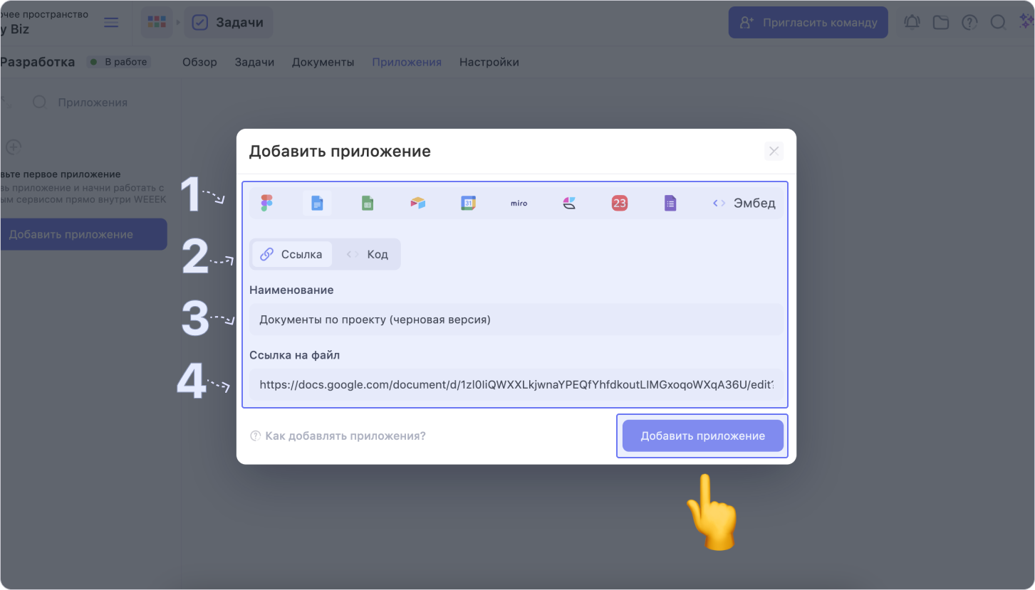 Добавить гугл-документ в проект Weeek можно с помощью приложений проекта