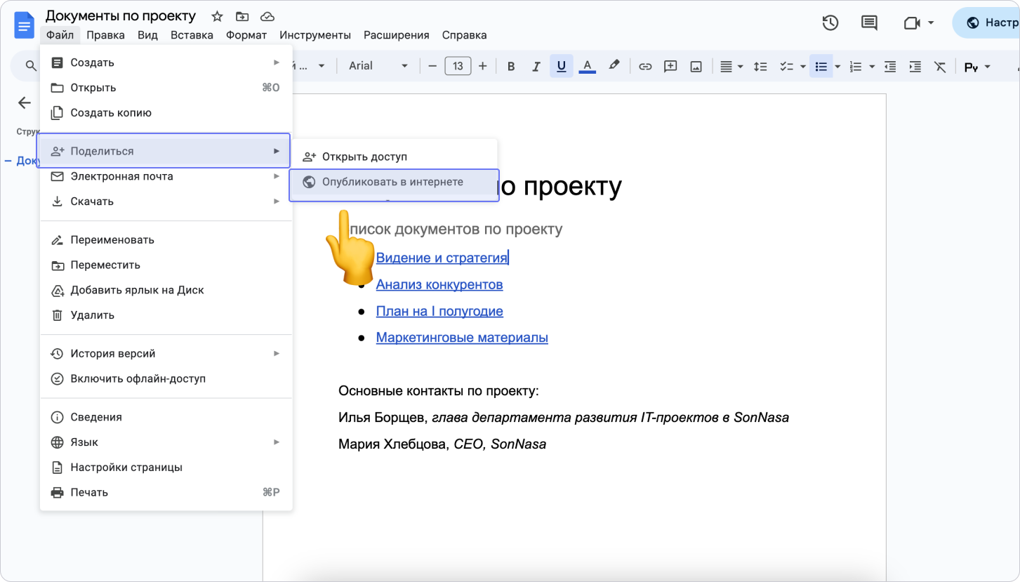 Перейди в гугл-документ, который ты хочешь добавить в Weeek. На панели инструментов перейди в разделы меню Файл → Поделиться → Опубликовать в интернете