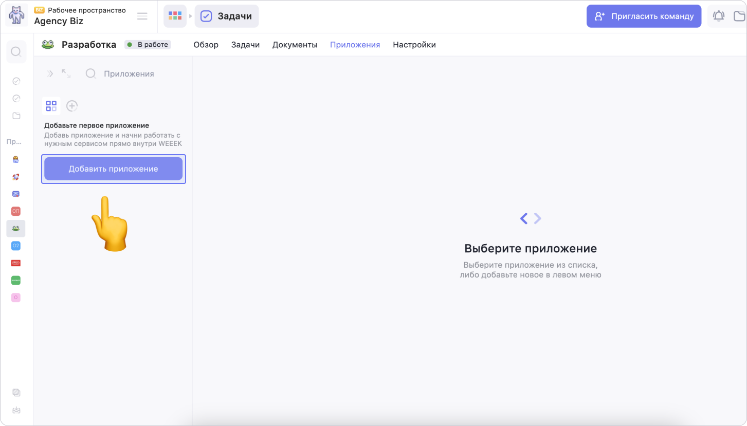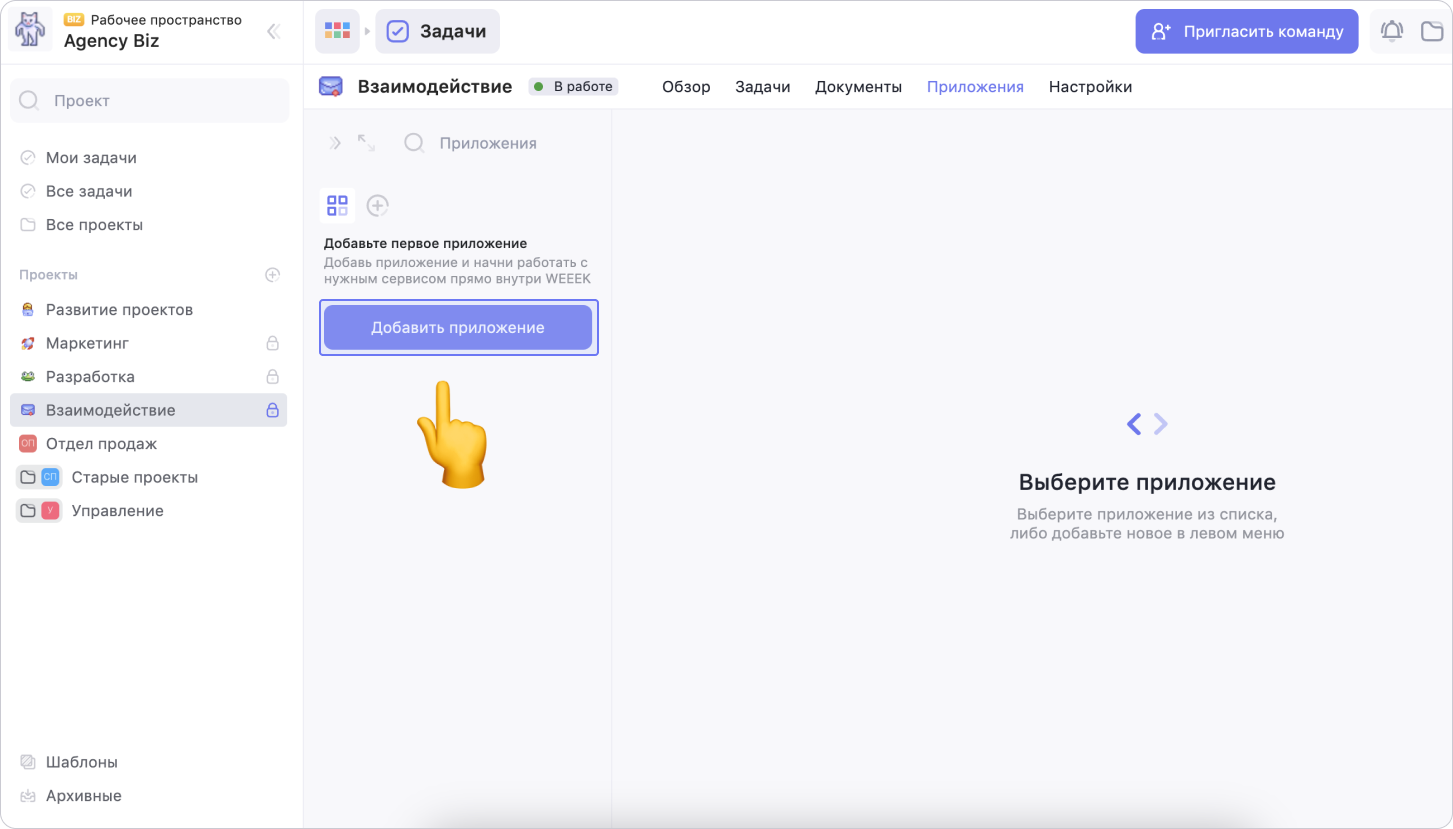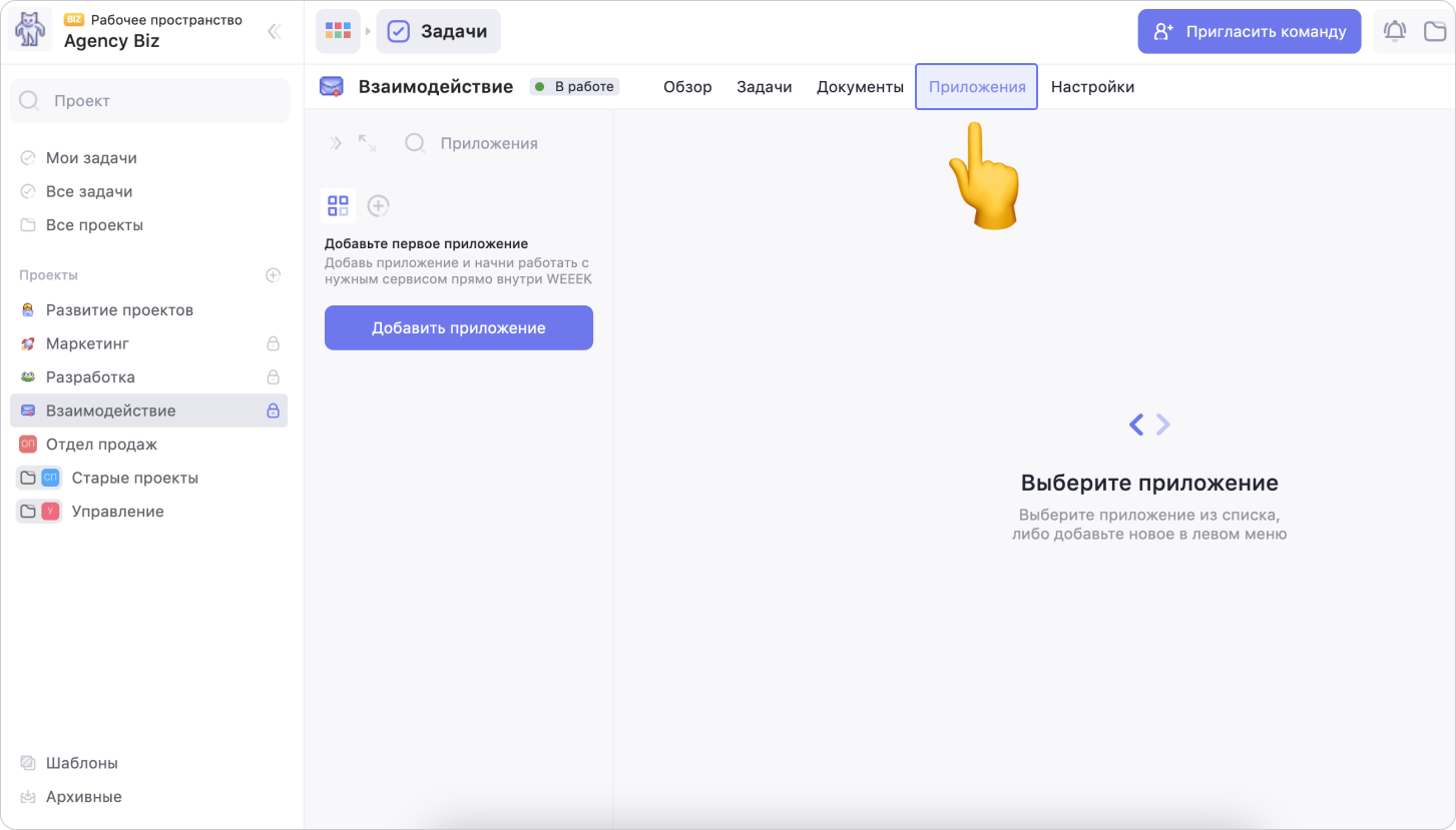 Перейди в проект Weeek, в который нужно добавить гугл-документ. В меню проекта выбери раздел Приложения