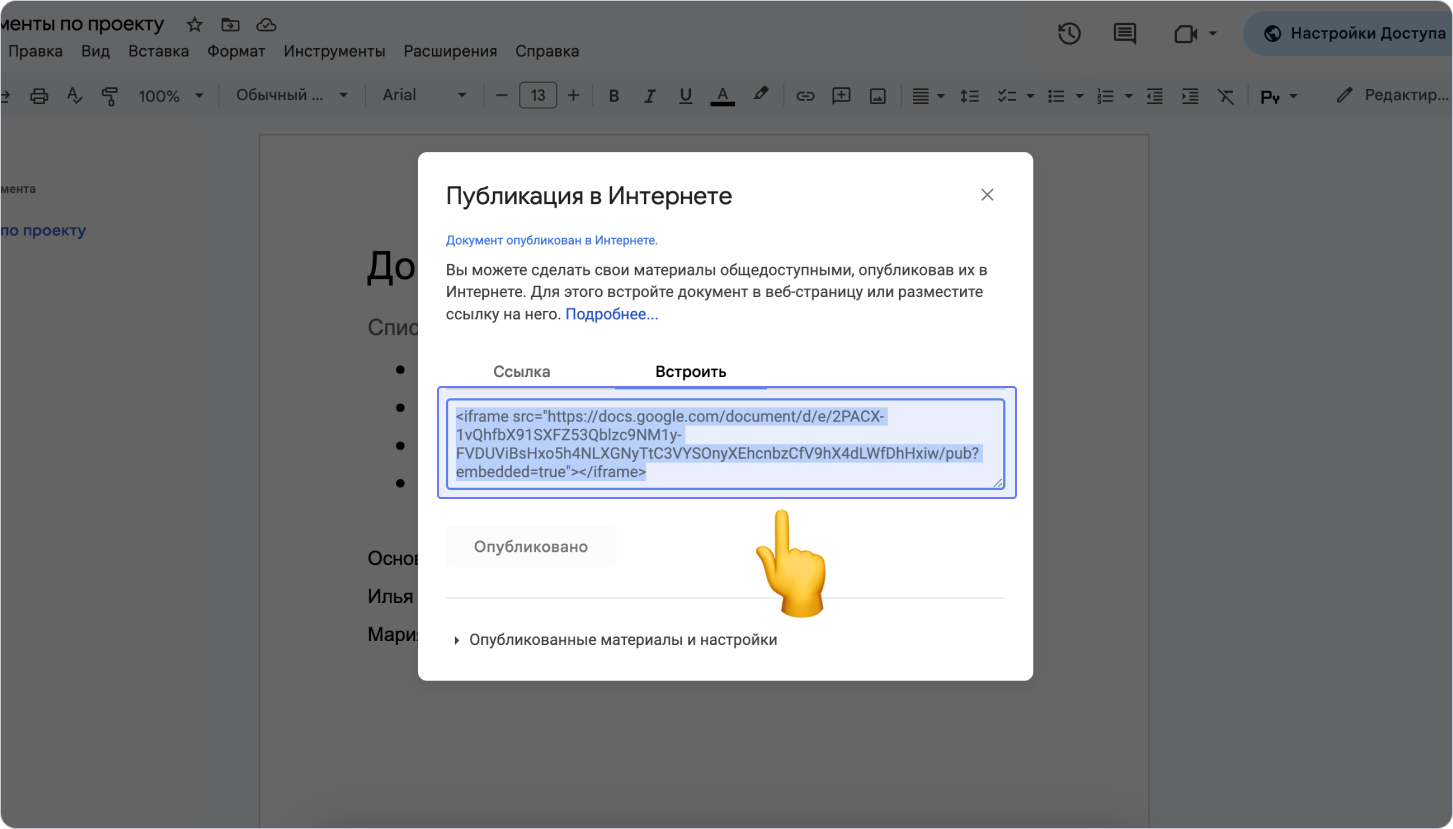В модальном окне нажми на кнопку Опубликовать, а затем перейди на вкладку Встроить