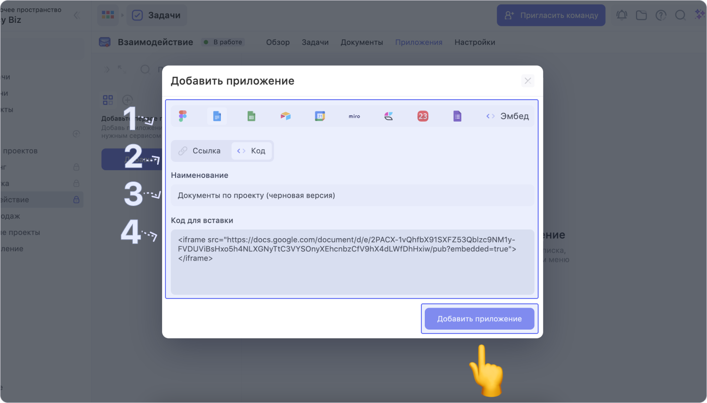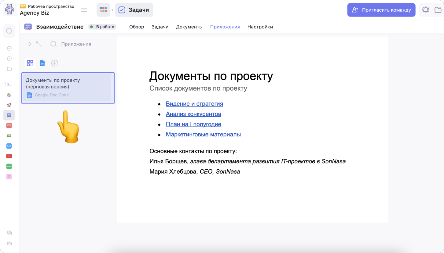 Добавленный гугл-документ будет доступен в приложениях проекта