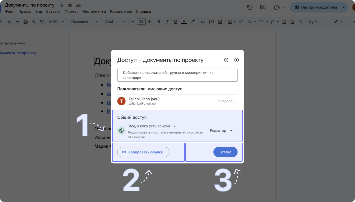 Включи (1) общий доступ по ссылке, (2) скопируй ссылку и нажми на кнопку Готово