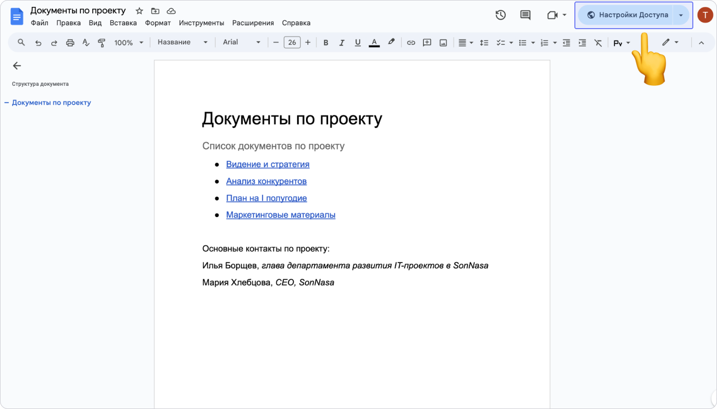 Открой Google документ, который хочешь прикрепить к проекту. Нажми на кнопку Настройки доступа