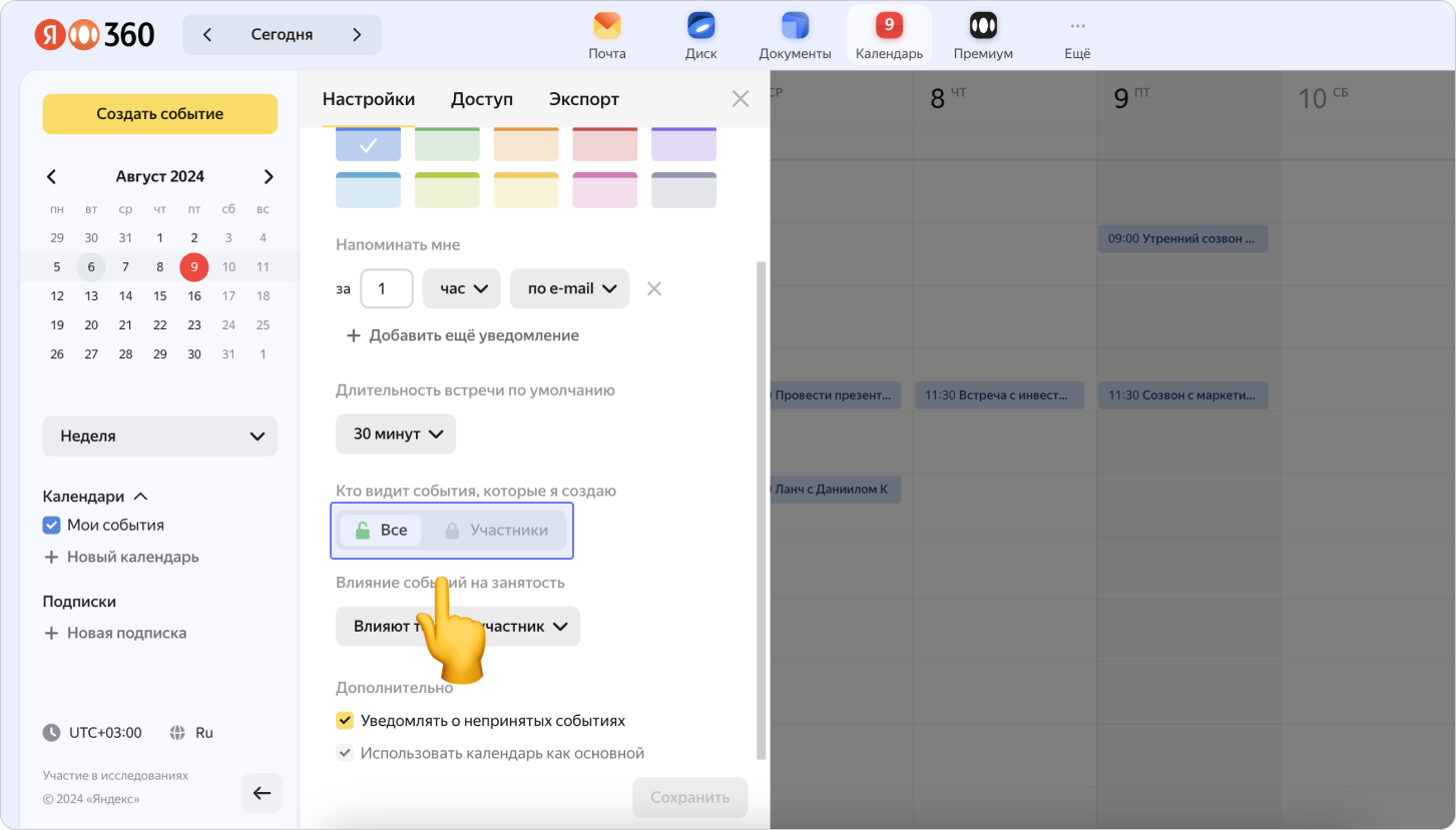 Чтобы по скопированной публичной ссылке календарь могли смотреть другие пользователи, во вкладке Настройки в поле Кто видит события, которые я создаю выбери вариант Все