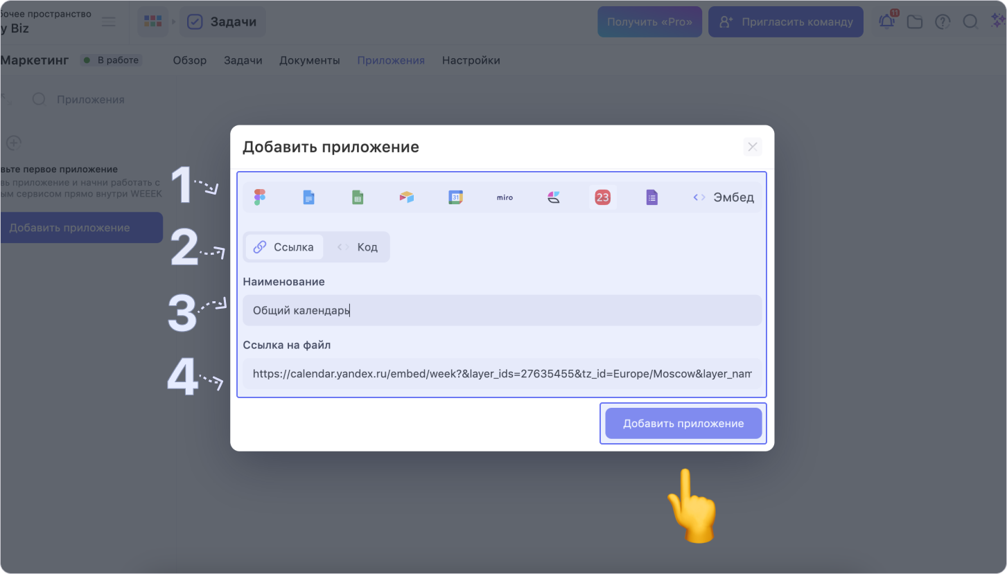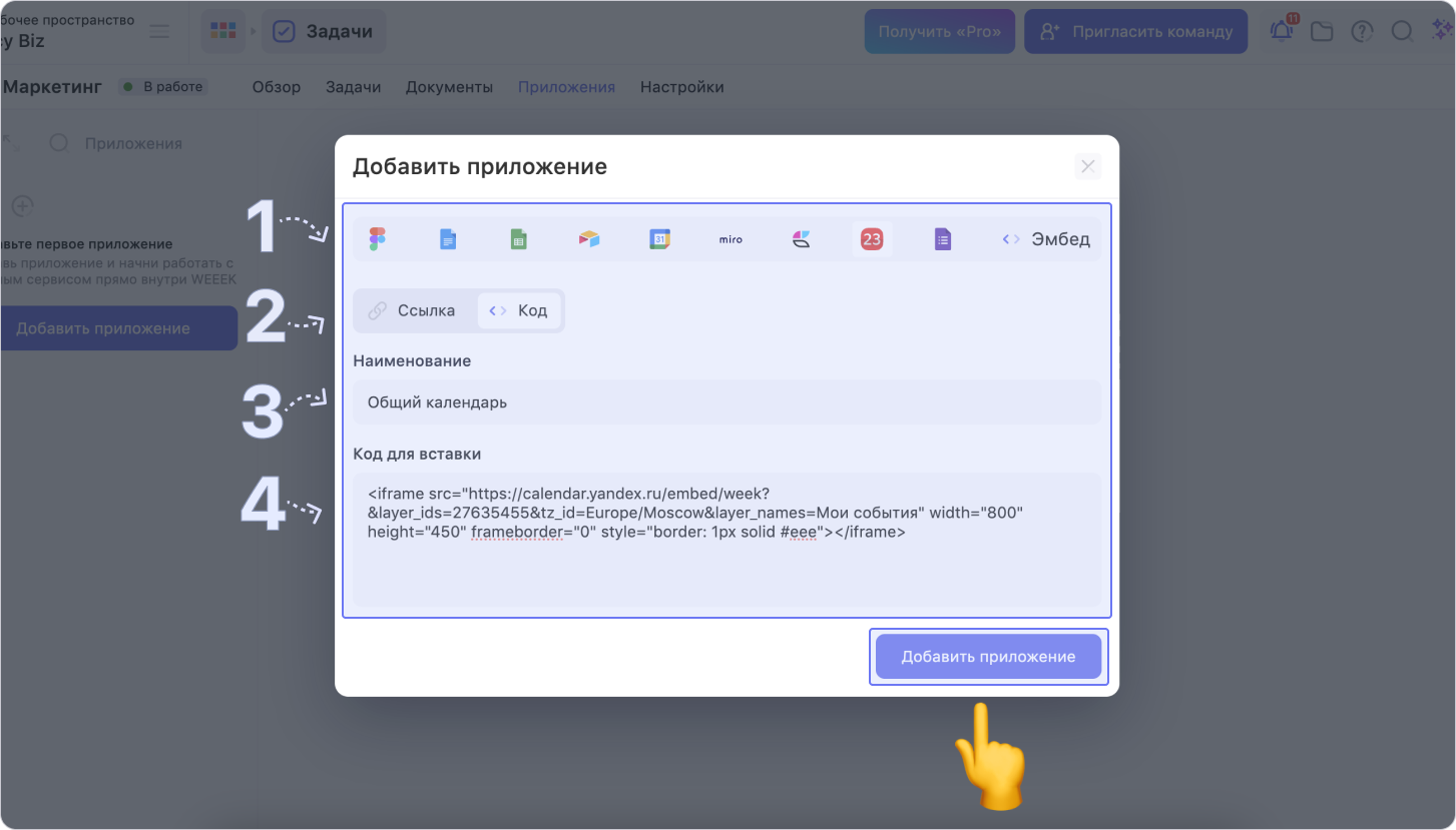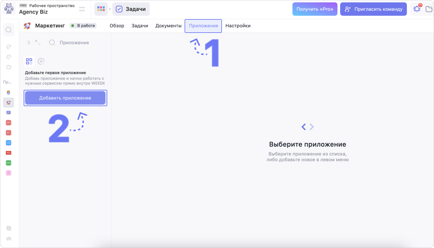Перейди в нужный проект в рабочем пространстве Weeek, (1) в меню проекта выбери раздел Приложения, а затем (2) нажми на кнопку Добавить приложение