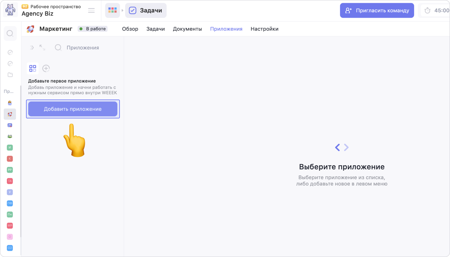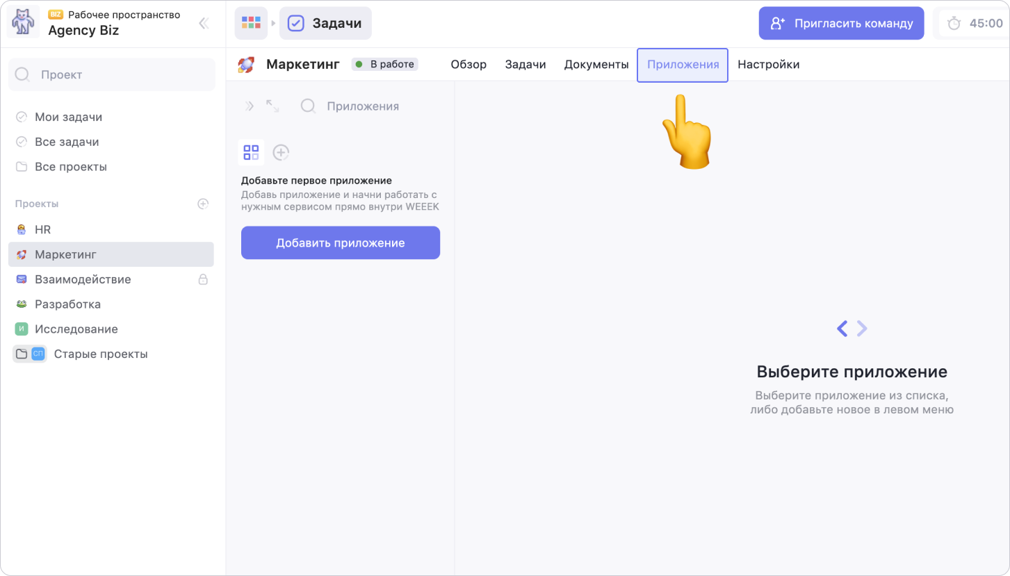 Перейди в проект Weeek, в который хочешь подключить приложение. В меню проекта выбери раздел Приложения
