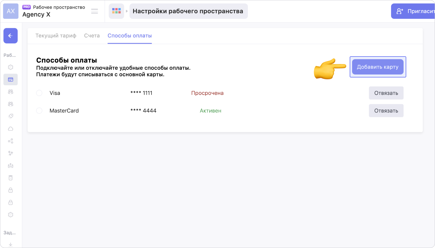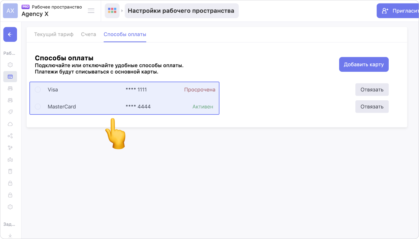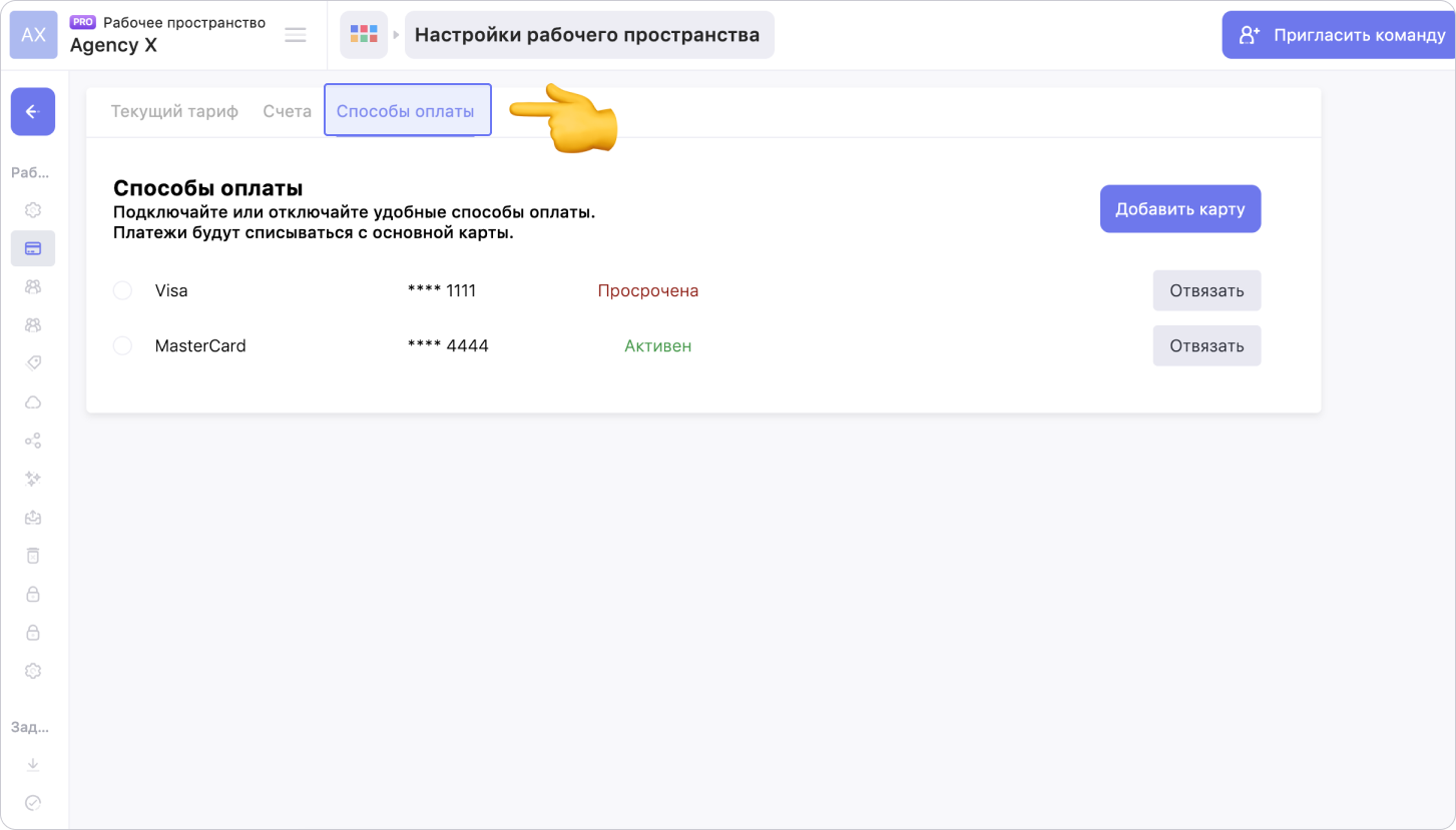 При оплате подписки банковской картой, Weeek прикрепляет данные карты к рабочему пространству, с которого выполнялась оплата