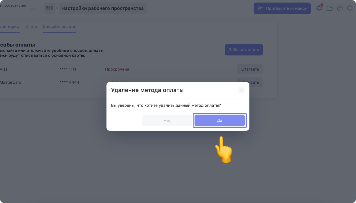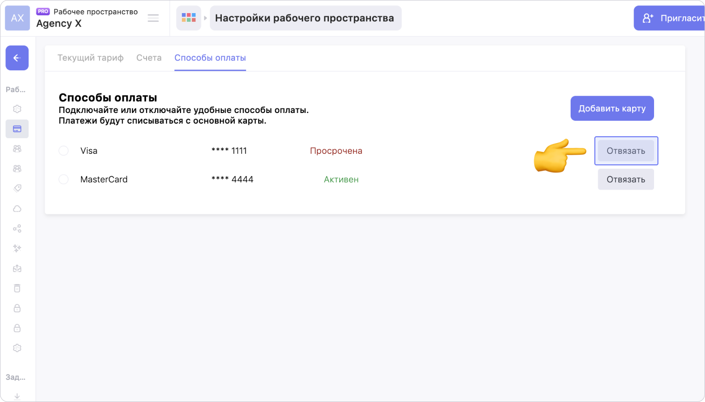 Как отвязать банковскую карту от рабочего пространства в Weeek