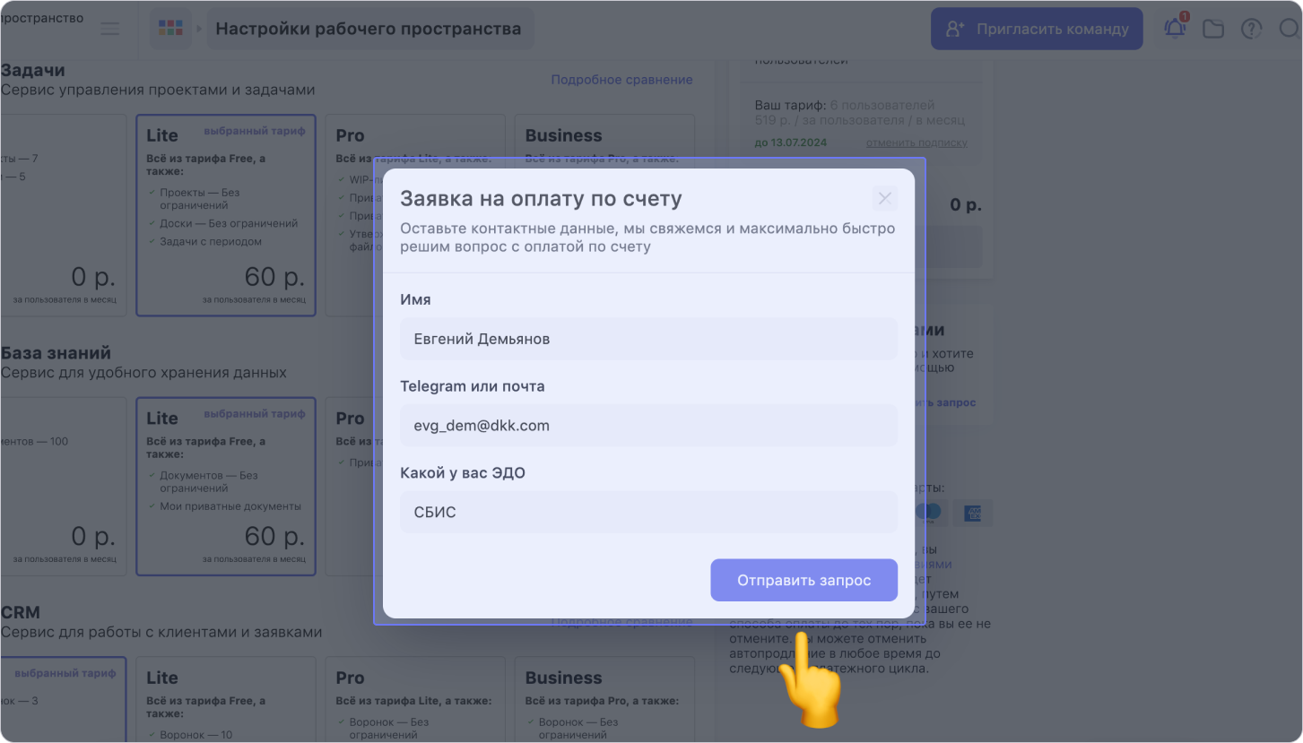 В модальном окне укажи своё имя, контактные данные и ЭДО, а затем нажми на кнопку Отправить запрос