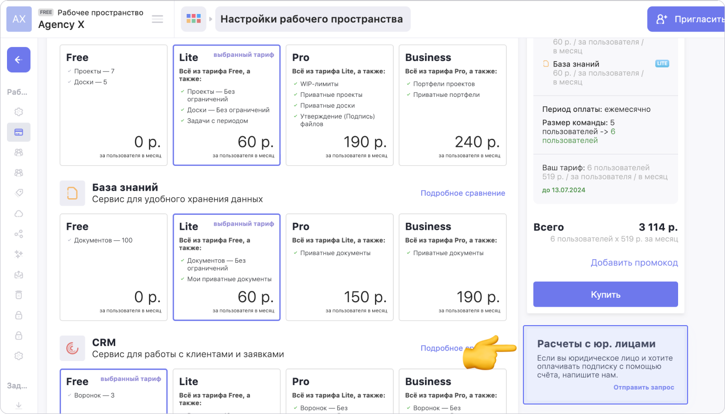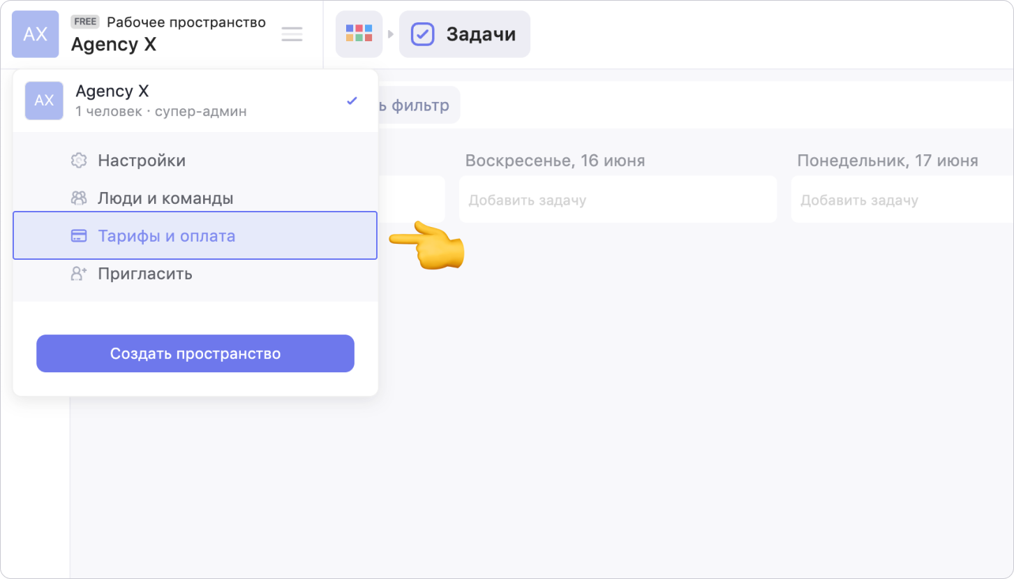 Если ты представляешь юридическое лицо и хочешь оплачивать подписку по счёту, нажми на название рабочего пространства в левом верхнем углу и перейди в Тарифы и оплата