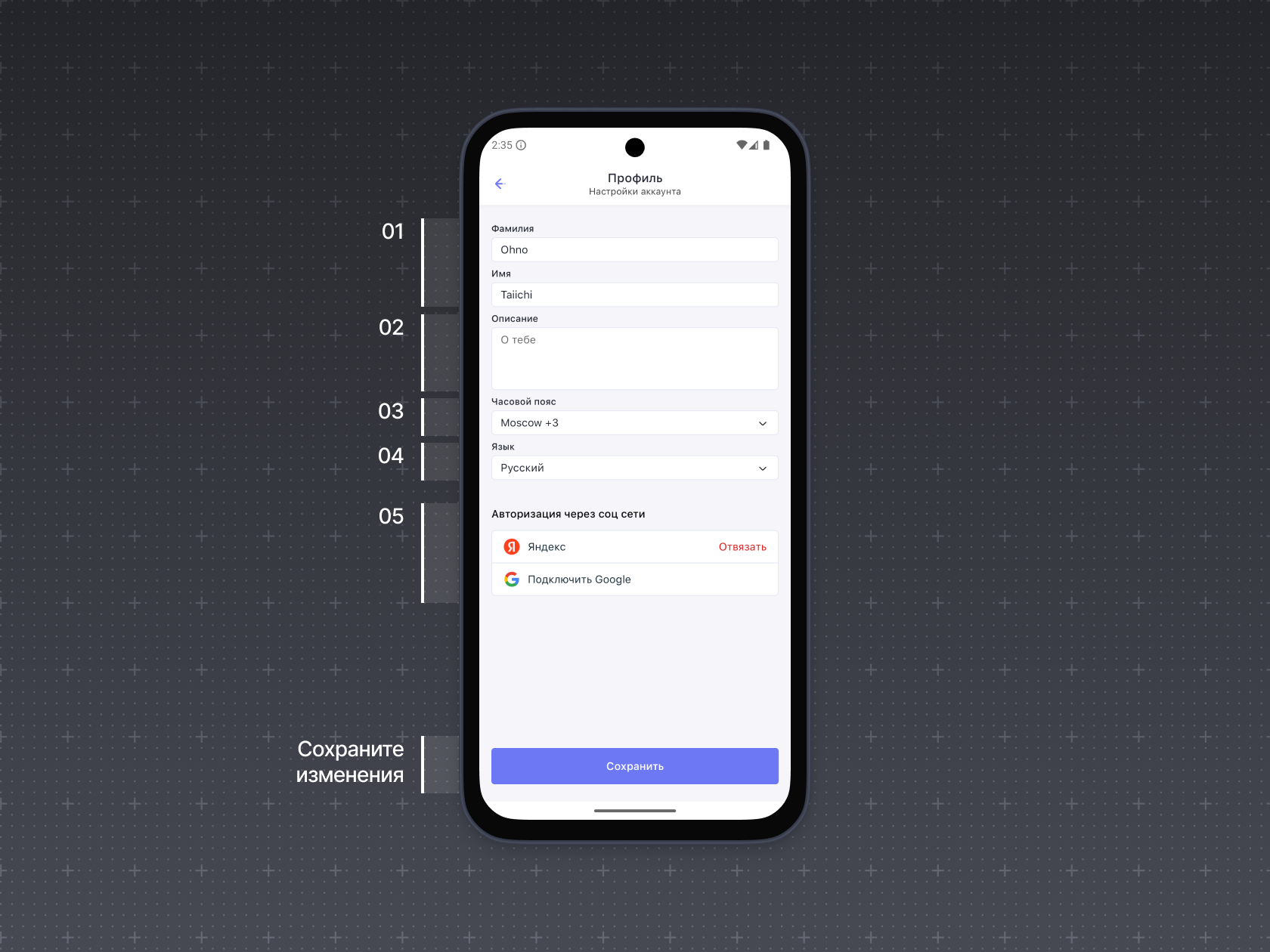 1. Изменить личные данные: имя и фамилию