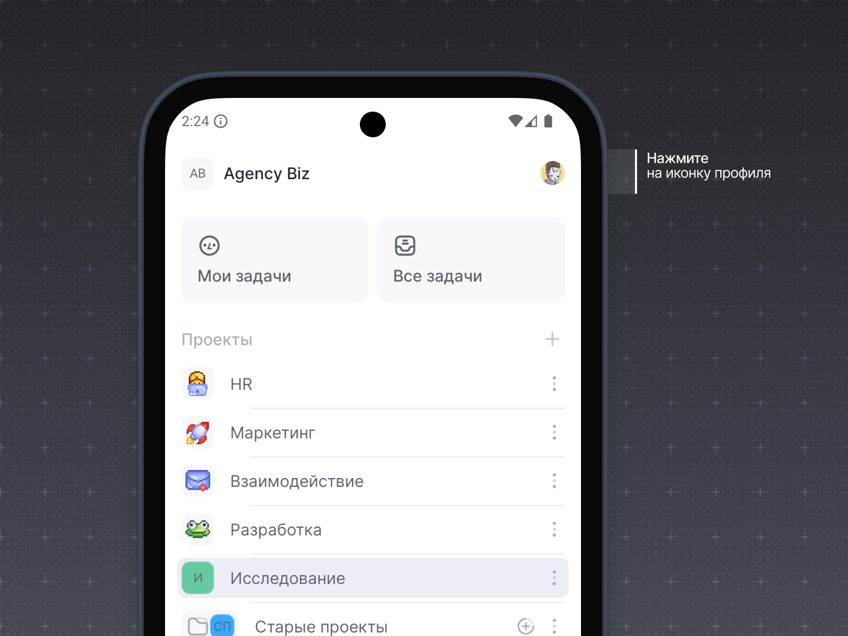 Чтобы перейти в настройки аккаунта в Weeek Android, нажмите на иконку профиля в правом верхнем углу.