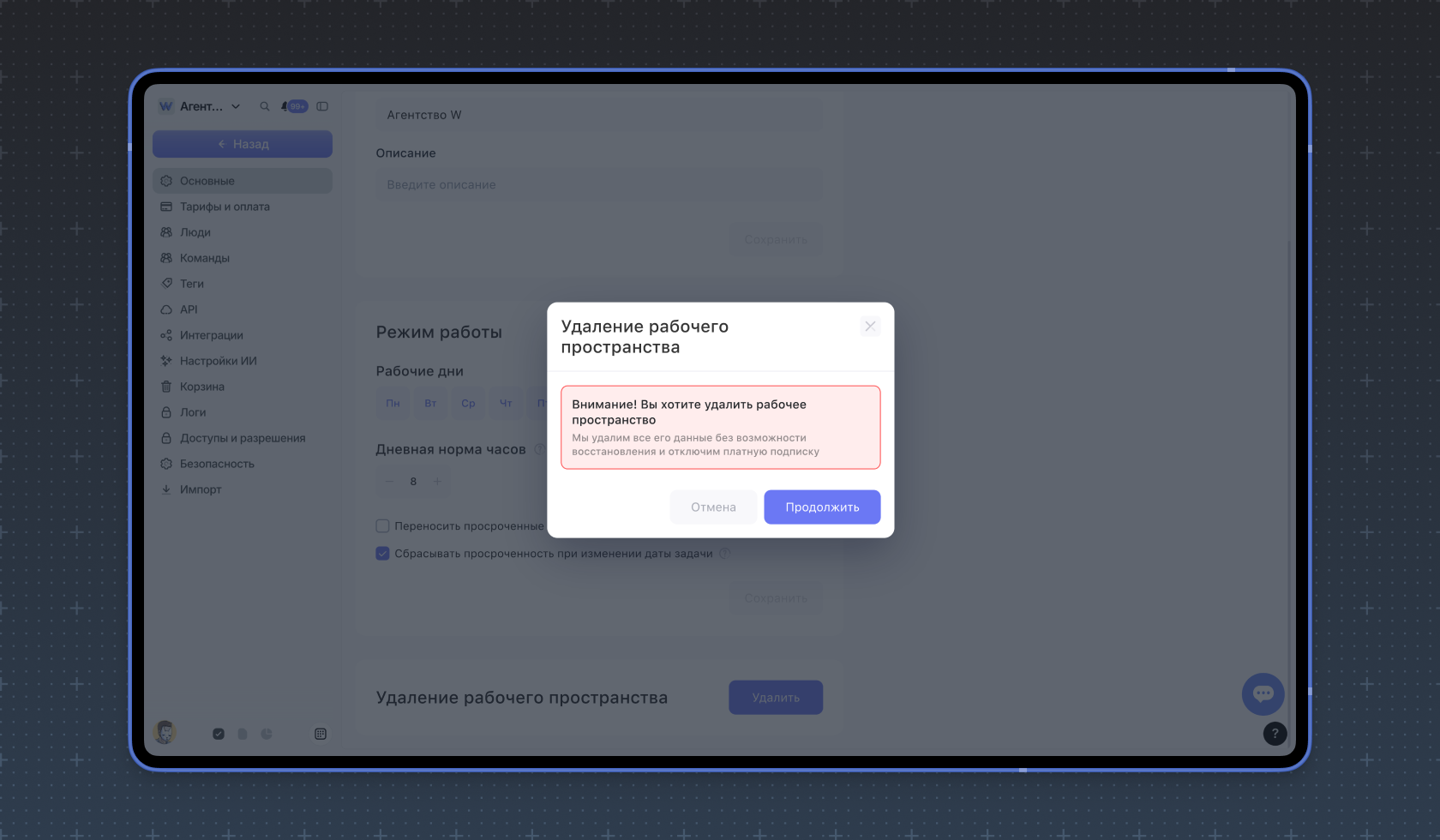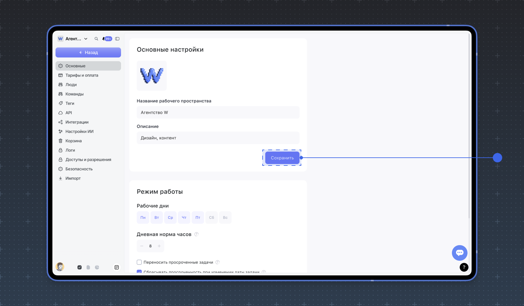 Менять настройки рабочего пространства могут только его пользователи с ролями Админ и Супер-админ.
