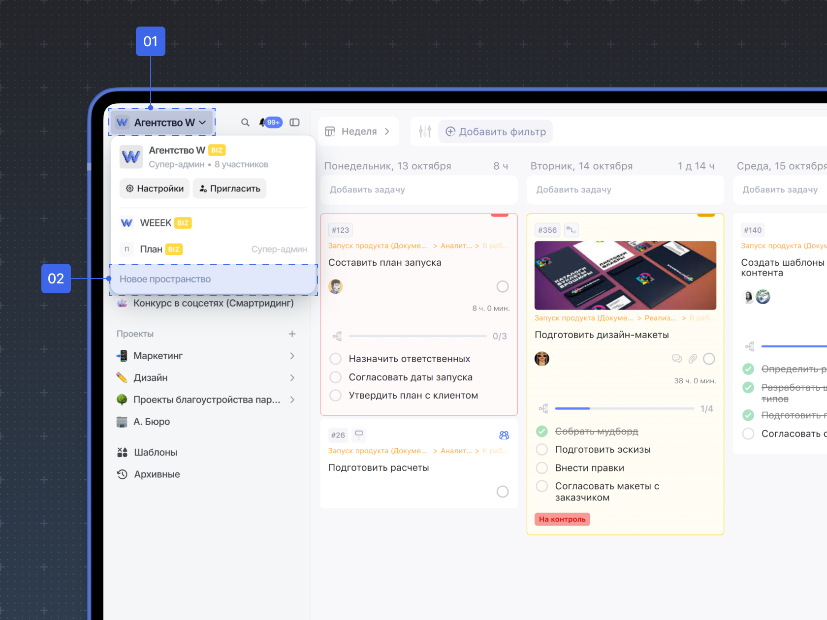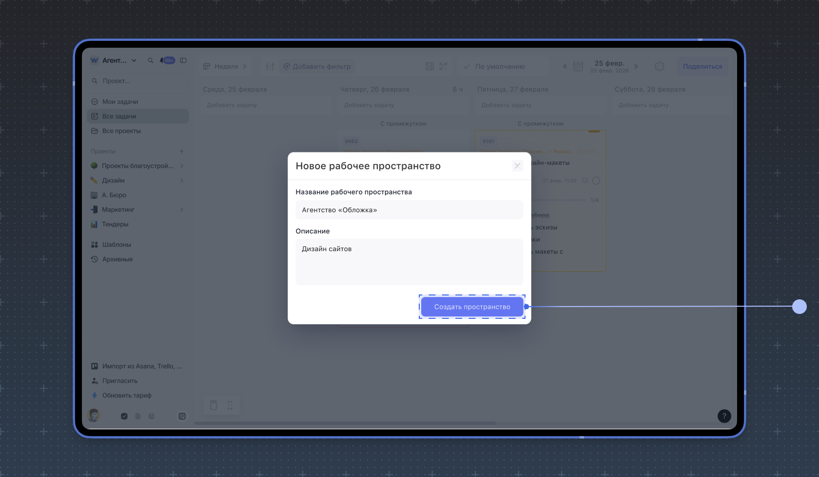 Рабочее пространство — это основное хранилище остальных сущностей WEEEK. Все задачи, проекты, база знаний и пользователи находятся внутри рабочего пространства.